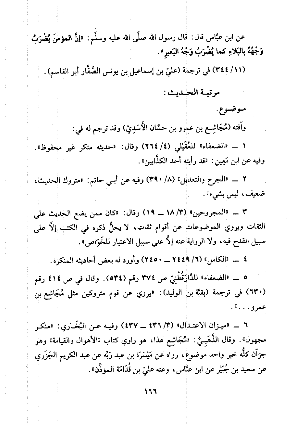 ٦ - "ميزان الاعتدال" (٣/ ٤٣٦ - ٤٣٧) وفيه عن البُخَاري: "منكر مجهول". وقال الذَّهَبِيُّ: "مُجَاشِع هذا، هو راوي كتاب "الأهوال والقيامة" وهو جزآن كلُّه خبر واحد موضوع، رواه عن مَيْسَرَة بن عبد رَبِّه عن عبد الكريم الجَزَري عن سعيد بن جُبَيْر عن ابن عبَّاس، وعنه عليّ بن قُدَامَة المؤذِّن".