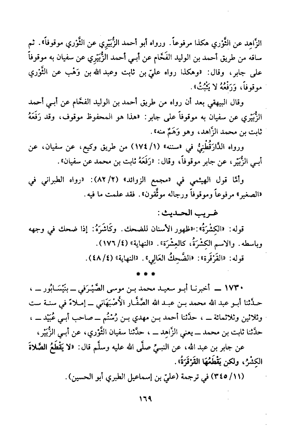 ١٧٣٠ - أخبرنا أبو سعيد محمد بن موسى الصَّيْرَفي -بنَيْسَابُور-، حدَّثنا أبو عبد اللَّه محمد بن عبد اللَّه الصَّفَّار الأَصْبَهَاني -إملاءً في سنة ست وثلاثين وثلاثمائة-، حدَّثنا أحمد بن مهدي بن رُسْتُم -صاحب أبي عُبَيْد-، حدَّثنا ثابت بن محمد -يعني الزَّاهِد-، حدَّثنا سفيان الثُّوْري، عن أبي الزُّبَيْر،