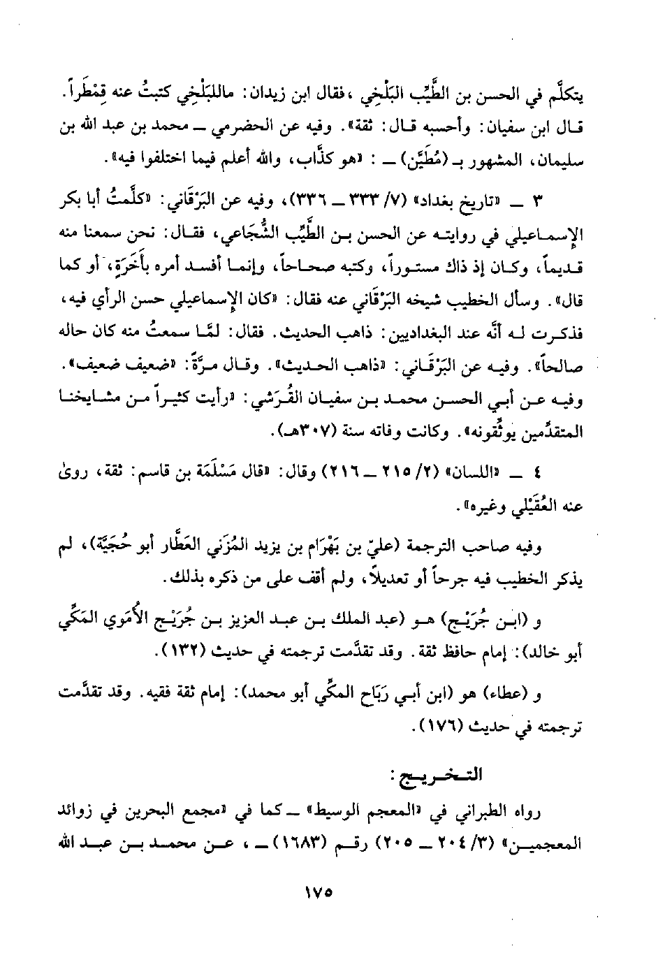 ٣ - "تاريخ بغداد" (٧/ ٣٣٣ - ٣٣٦)، وفيه عن البَرْقَاني: "كلَّمتُ أبا بكر الإسماعيلي في روايته عن الحسن بن الطَّيِّب الشُّجَاعي، فقال: نحن سمعنا منه قديمًا، وكان إذ ذاك مستورًا، وكتبه صحاحًا، وإنَّما أفسد أمره بأَخَرَةٍ، أو كما قال". وسأل الخطيب شيخه البَرْقَاني عنه فقال: "كان الإسماعيلي حسن الرأي فيه، فذكرت له أنَّه عند البغداديين: ذاهب الحديث. فقال: لمَا سمعتُ منه كان حاله صالحًا". وفيه عن البَرْقَاني: "ذاهب الحديث". وقال مرَّةً: "ضعيف ضعيف". وفيه عن أبي الحسن محمد بن سفيان القُرَشِي: "رأيت كثيرًا من مشايخنا المتقدِّمين يوثِّقونه". وكانت وفاته سنة (٣٠٧ هـ).