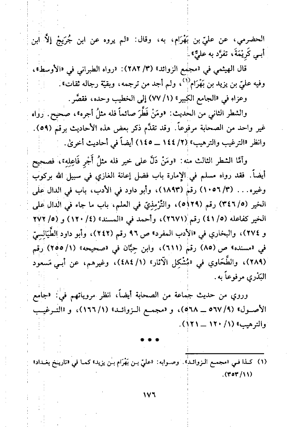 وأمَّا الشطر الثالث منه: "ومَنْ دَلَّ على خير فله مثلُ أَجْرِ فَاعِلِهِ"، فصحيح أيضًا. فقد رواه مسلم في الإمارة باب فضل إعانة الغازي في سبيل اللَّه بركوب وغيره. . . (٣/ ١٠٥٦) رقم (١٨٩٣)، وأبو داود في الأدب، باب في الدال على الخير (٥/ ٣٤٦) رقم (٥١٢٩)، والتِّرْمِذِيّ في العلم، باب ما جاء في الدال على الخير كفاعله (٥/ ٤١) رقم (٢٦٧١)، وأحمد في "المسند" (٤/ ١٢٠) و (٥/ ٢٧٢ و ٢٧٤)، والبخاري في "الأدب المفرد" ص ٩٦ رقم (٢٤٢)، وأبو داود الطَّيَالِسِيّ في "مسنده" ص (٨٥) رقم (٦١١)، وابن حِبَّان في "صحيحه" (١/ ٢٥٥) رقم (٢٨٩)، والطَّحَاوي في "مُشْكِل الآثار" (١/ ٤٨٤)، وغيرهم، عن أبي مَسعود البَدْري مرفوعًا به.