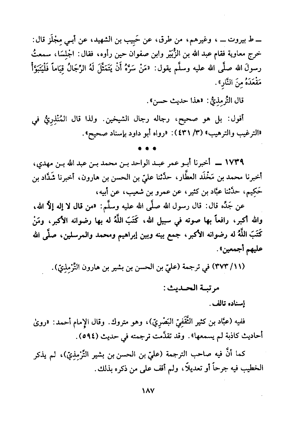١٧٣٩ - أخبرنا أبو عمر عبد الواحد بن محمد بن عبد اللَّه بن مهدي، أخبرنا محمد بن مَخْلَد العَطَّار، حدَّثنا عليّ بن الحسن بن هارون، أخبرنا شَدَّاد بن حَكِيم، حدَّثنا عبَّاد بن كثير، عن عمرو بن شعيب، عن أبيه،