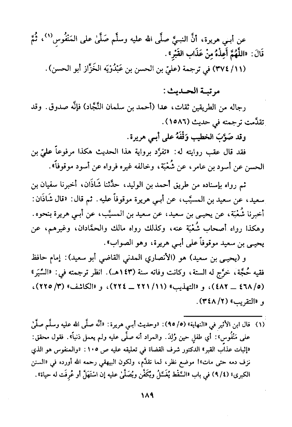 (¬١) قال ابن الأثير في "النهاية" (٥/ ٩٥): "وحديث أبي هريرة: "أنَّه صلَّى اللَّه عليه وسلَّم صلَّى على مَنْفُوسٍ": أي طفل حين وُلِدَ. والمراد أنَّه صلَّى عليه ولم يعمل ذنبًا". فقول محقق: "إثبات عذاب القبر" الدكتور شرف القضاة في تعليقه عليه ص ١٠٥: "والمنفوس هو الذي نزف دمه حتَّى مات"! موضع نظر، لما تقدَّم، ولكون البيهقي رحمه اللَّه أورده في "السنن الكبرى" (٤/ ٩) في باب "السَّقْط يُغَسَّلُ ويُكَفَّن ويُصَلَّى عليه إن اسْتَهَلَّ أو عُرِفَت له حياة".