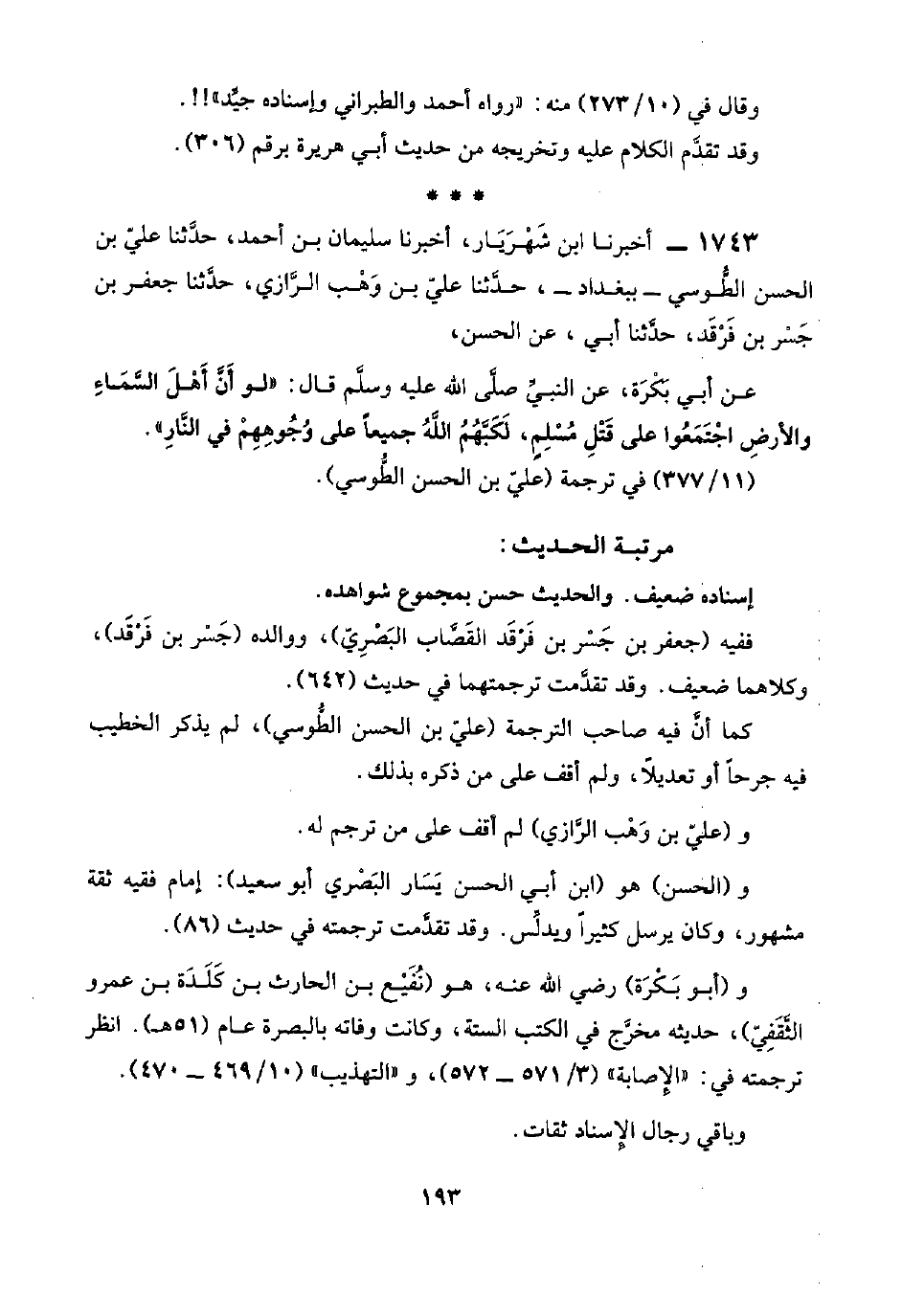 ١٧٤٣ - أخبرنا ابن شَهْرَيَار، أخبرنا سليمان بن أحمد، حدَّثنا عليّ بن الحسن الطُّوسِيّ -ببغداد-، حدَّثنا عليّ بن وَهْب الرَّازي، حدَّثنا جعفر بن جَسْر بن فَرْقَد، حدَّثنا أبي، عن الحسن،