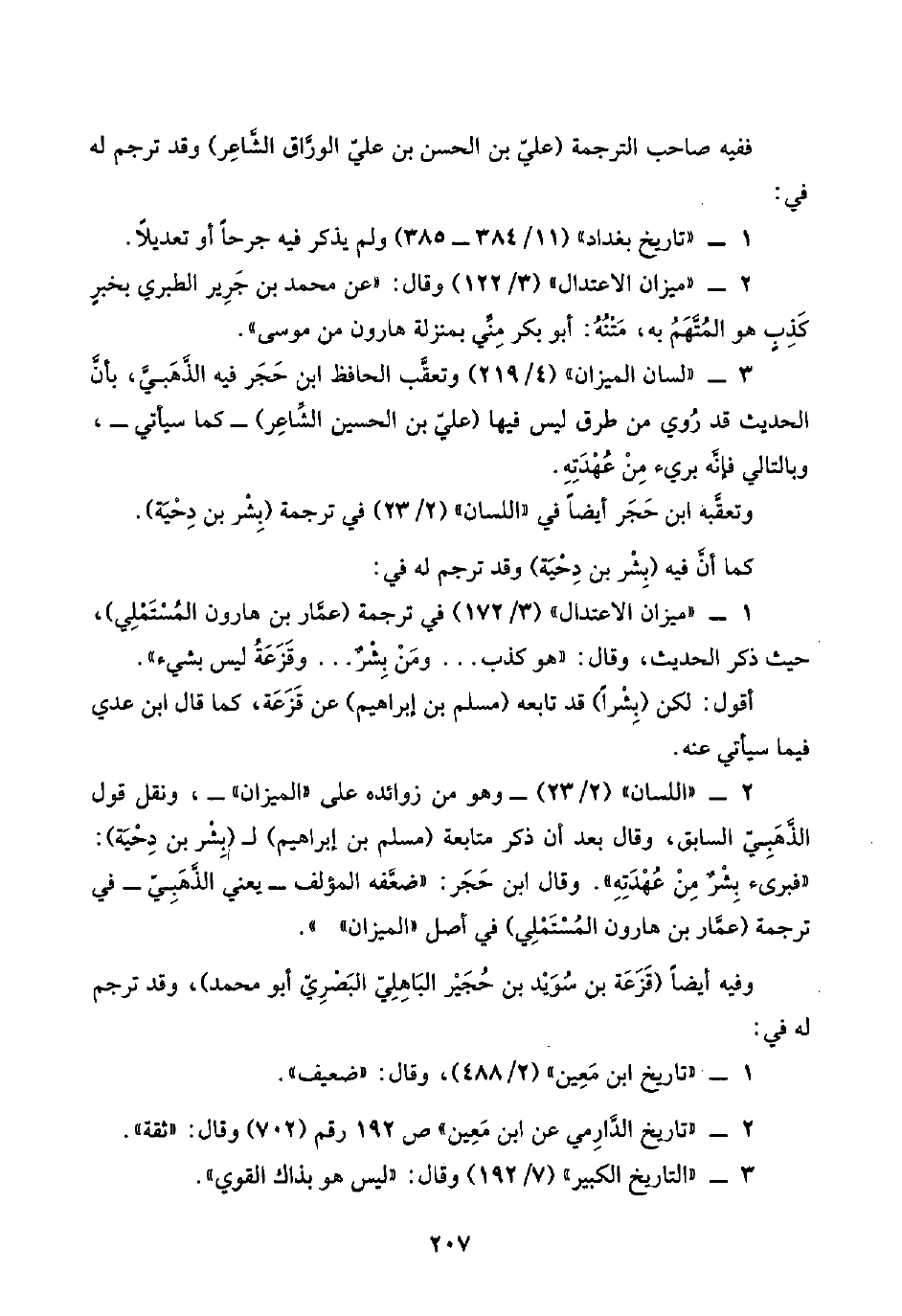٢ - "اللسان" (٢/ ٢٣) -وهو من زوائده على "الميزان"-، ونقل قول الذَّهَبِيُّ السابق، وقال بعد أن ذكر متابعة (مسلم بن إبراهيم) لـ (بِشْر بن دِحْيَة): "فبرئ بِشْرٌ من عُهْدَتِهِ". وقال ابن حَجَر: "ضعَّفه المؤلف -يعني الذَّهَبِيُّ- في ترجمة (عمَّار بن هارون المُسْتَمْلِي) في أصل "الميزان"".