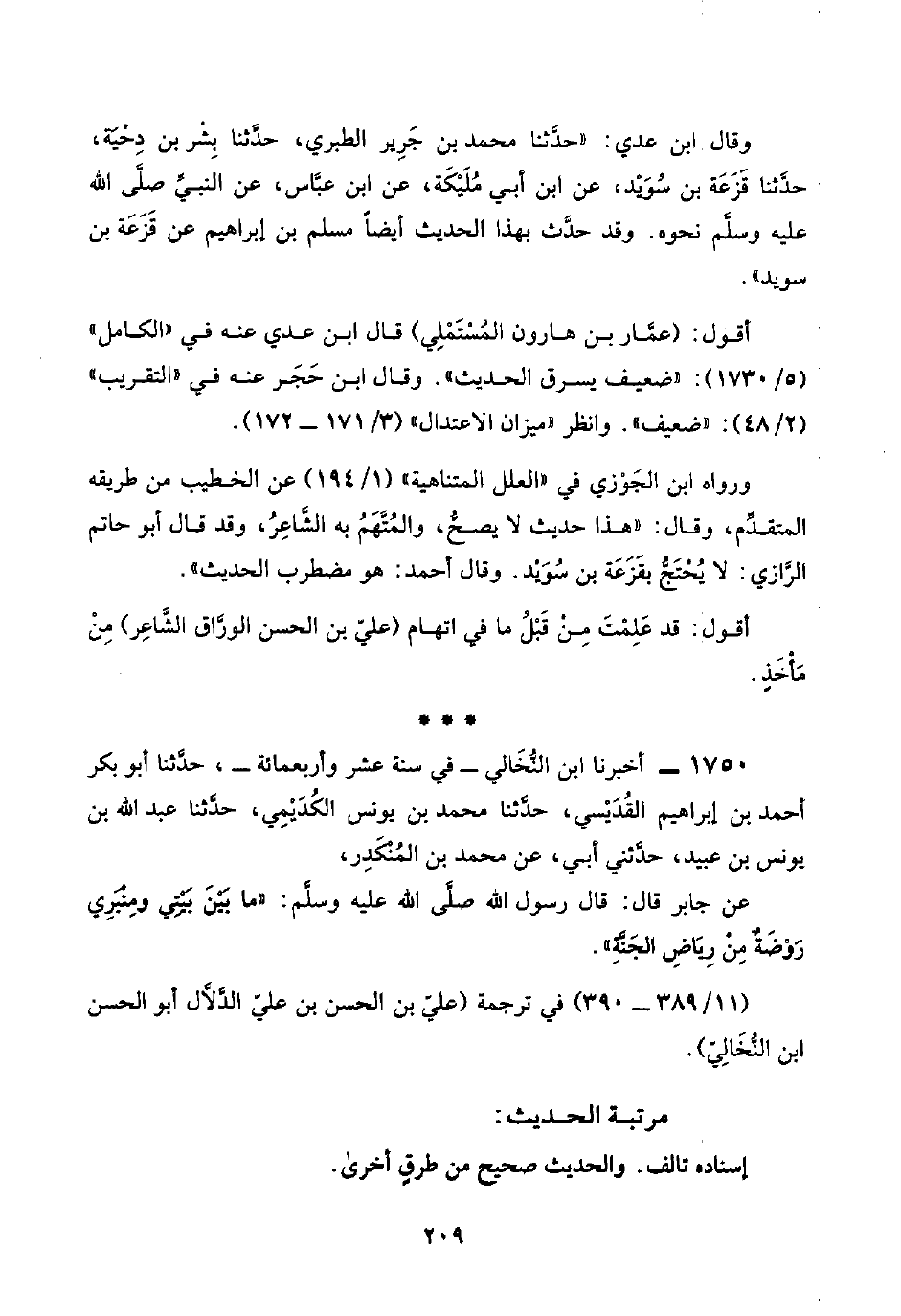 ورواه ابن الجَوْزي في "العلل المتناهية" (١/ ١٩٤) عن الخطيب من طريقه المتقدِّم، وقال: "هذا حديث لا يصحُّ، والمُتَّهَمُ به الشَّاعِرُ، وقد قال أبو حاتم الرَّازي: لا يُحْتَجُّ بقَزَعَة بن سُوَيْد. وقال أحمد: هو مضطرب الحديث".
