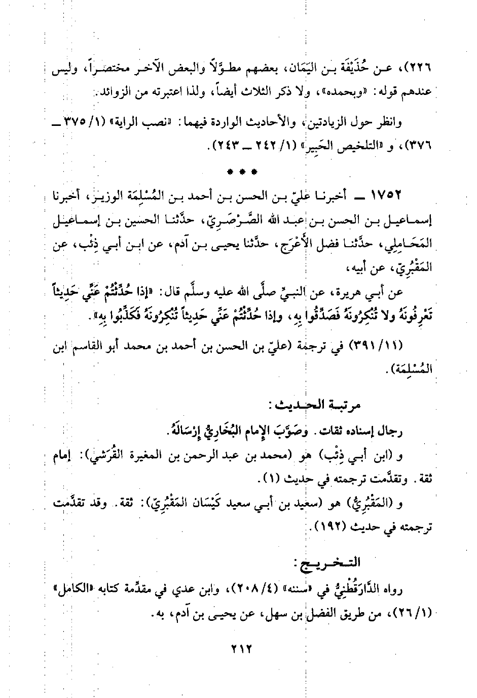 ١٧٥٢ - أخبرنا عليّ بن الحسن بن أحمد بن المُسْلِمَة الوزير، أخبرنا إسماعيل بن الحسن بن عبد اللَّه الصَّرْصَرِيّ، حدَّثنا الحسين بن إسماعيل المَحَامِلِي، حدَّثنا فضل الأَعْرَج، حدَّثنا يحيى بن آدم، عن ابن أبي ذِئْب، عن المَقْبُرِيّ، عن أبيه،