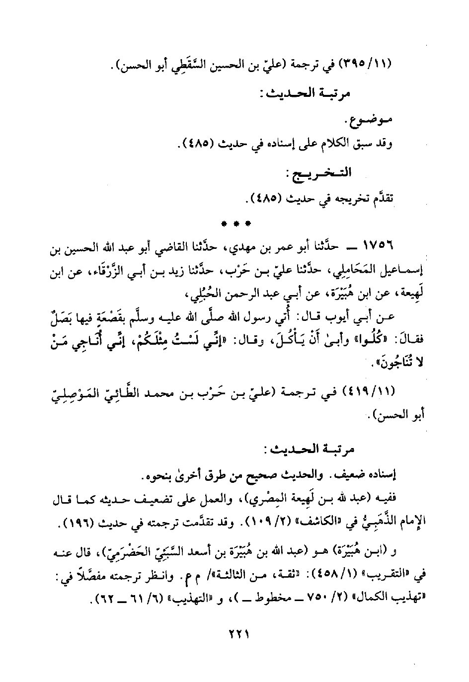 ١٧٥٦ - حدَّثنا أبو عمر بن مهدي، حدَّثنا القاضي أبو عبد اللَّه الحسين بن إسماعيل المَحَامِلِي، حدَّثنا عليّ بن حَرْب، حدَّثنا زيد بن أبي الزَّرْقَاء، عن ابن لَهِيعة، عن ابن هُبَيْرَة، عن أبي عبد الرحمن الحُبُلِي،