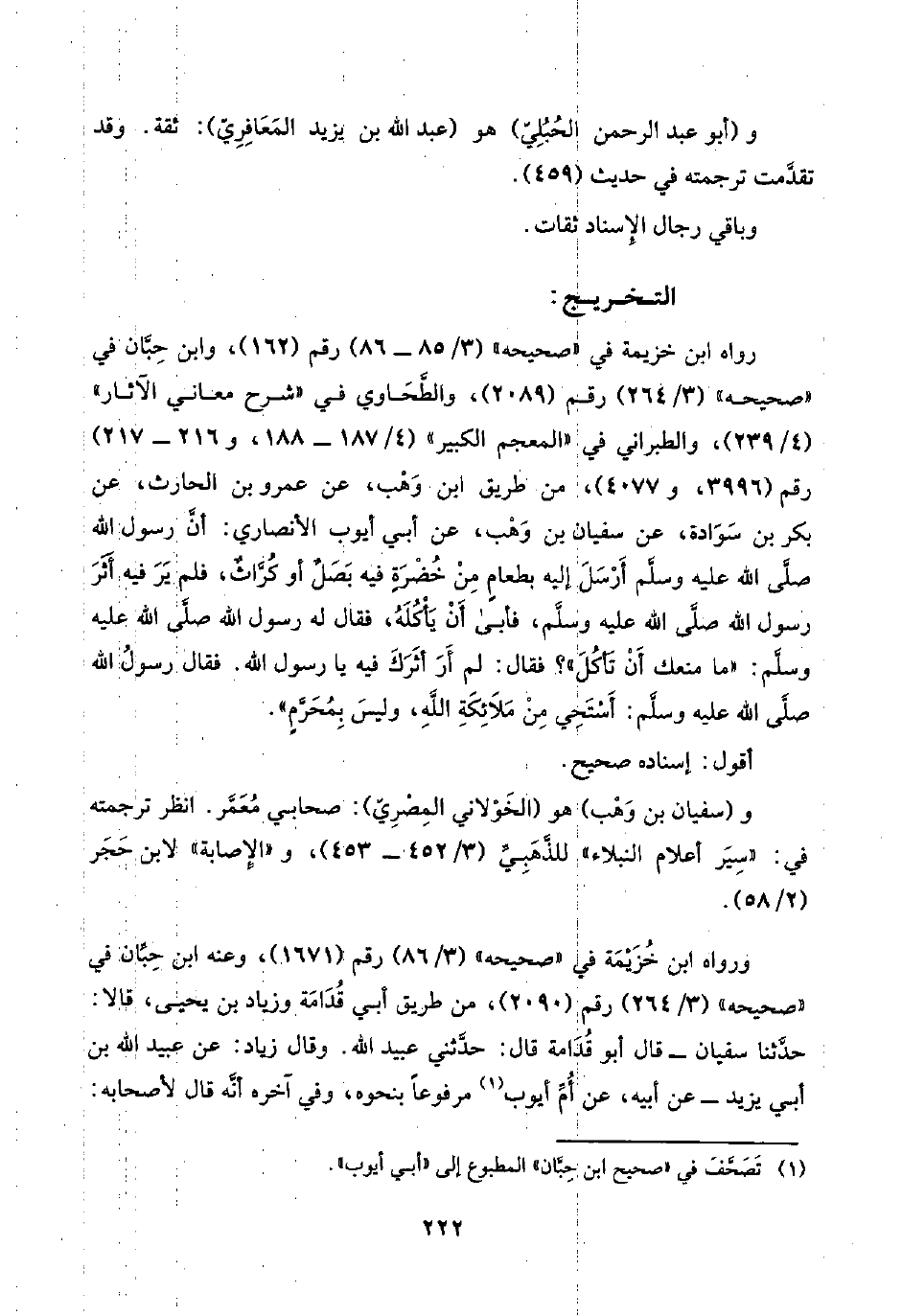 رواه ابن خزيمة في "صحيحه" (٣/ ٨٥ - ٨٦) رقم (١٦٢)، وابن حِبَّان في صحيحه" (٣/ ٢٦٤) رقم (٢٠٨٩)، والطحاوي في "شرح معاني الآثار" (٤/ ٢٣٩)، والطبراني في "المعجم الكبير" (٤/ ١٨٧ - ١٨٨ و ٢١٦ - ٢١٧) رقم (٣٩٩٦، و ٤٠٧٧)، من طريق ابن وَهْب، عن عمرو بن الحارث، عن بكر بن سَوَادة، عن سفيان بن وَهْب، عن أبي أيوب الأنصاري: أن رسول اللَّه صلَّى اللَّه عليه وسلَّم أَرْسَلَ إليه بطعامِ مِنْ خُضْرَةٍ فيه بَصَلٌ أو كُرَّاثٌ، فلم يَرَ فيه أَثَرَ رسول اللَّه صلَّى اللَّه عليه وسلَّم، فأبى أَنْ يَأْكُلَهُ، فقال له رسول اللَّه صلَّى اللَّه عليه وسلَّم: "ما منعك أَنِ تَأكُلَ"؟ فقال: لم أَرَ أَثَرَكَ فيه يا رسول اللَّه. فقال رسولُ اللَّه صلَّى اللَّه عليه وسلَّم: أَسْتَحِي مِنْ مَلَائِكَةِ اللَّهِ، وليسَ بِمُحَرَّمٍ".