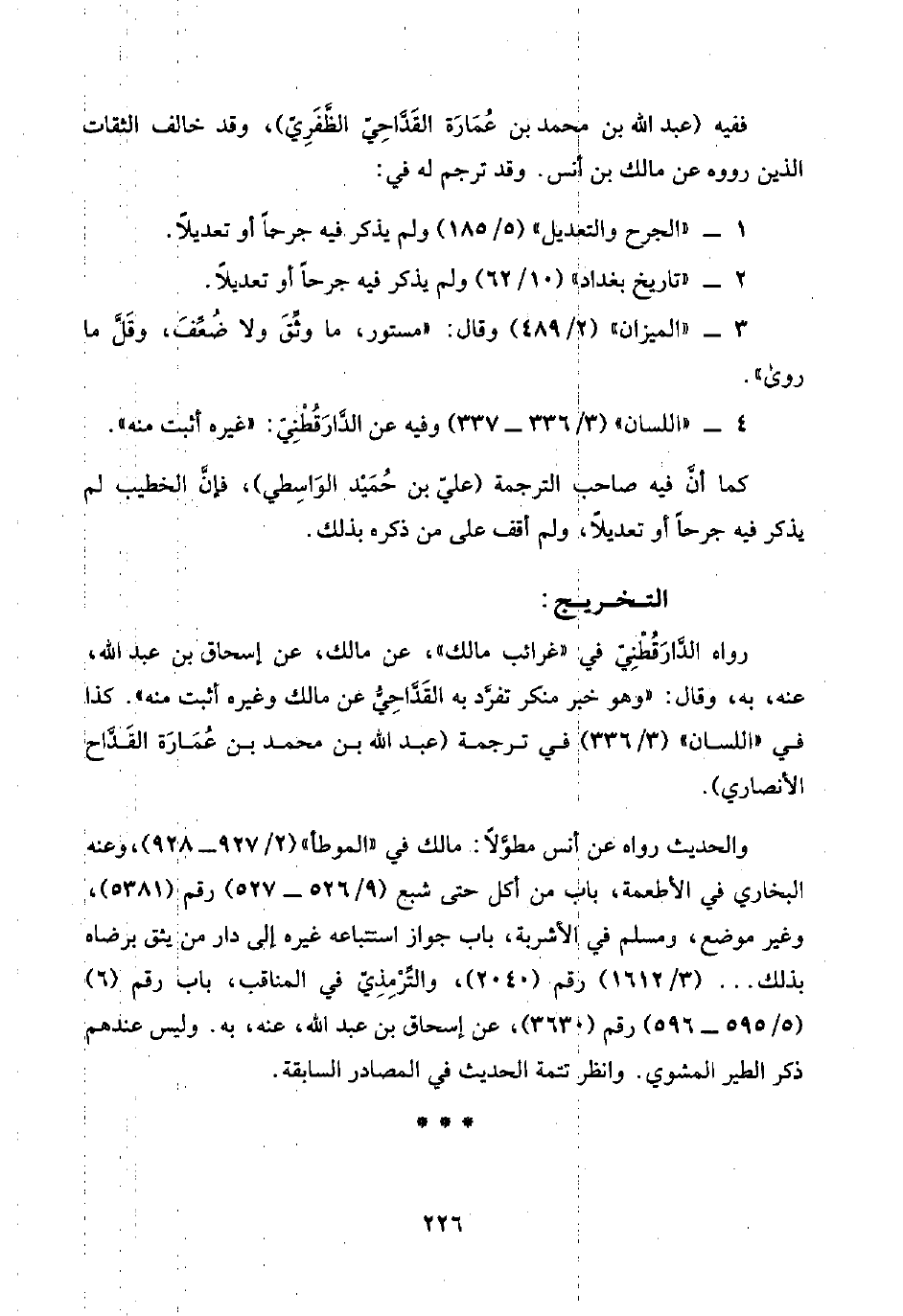 ففيه (عبد اللَّه بن محمد بن عُمَارة القَدَّاحِيّ الظَّفَرِيّ)، وقد خالف الثقات الذين رووه عن مالك بن أنس. وقد ترجم له في: