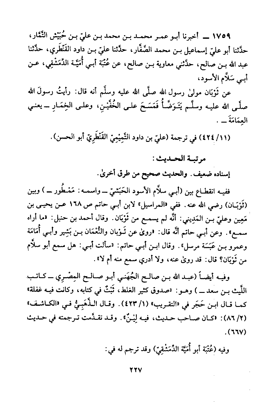 ١٧٥٩ - أخبرنا أبو عمر محمد بن محمد بن عليّ بن حُبَيْش التَّمَّار، حدَّثنا أبو عليّ إسماعيل بن محمد الصَّفَّار، حدَّثنا عليّ بن داود القَنْطَري، حدَّثنا عبد اللَّه بن صالح، حدَّثني معاوية بن صالح، عن عُتْبَة أبي أُمَيَّة الدِّمَشْقِيّ، عن أبي سَلَّام الأسود،