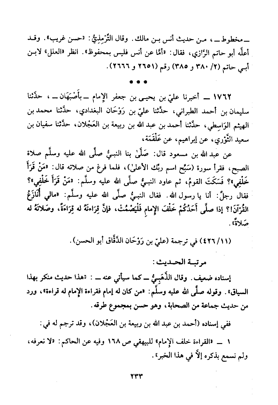 ١٧٦٢ - أخبرنا عليّ بن يحيى بن جعفر الإِمام -بأَصْبَهَان-، حدَّثنا سليمان بن أحمد الطبراني، حدَّثنا عليّ بن رَوْحَان البغدادي، حدَّثنا محمد بن الهيثم الوَاسِطي، حدَّثنا أحمد بن عبد اللَّه بن ربيعة بن العَجْلان، حدَّثنا سفيان بن سعيد الثَّوْري، عن إبراهيم، عن عَلْقَمَة، عن عبد اللَّه بن مسعود قال: صَلَّى بنا النبيُّ صلَّى اللَّه عليه وسلَّم صلاة الصبح، فقرأ سورة {سَبِّحِ اسْمَ رَبِّكَ الْأَعْلَى}، فلما فرغ من صلاته قال: "مَنْ قَرَأَ خَلْفِي"؟ فَسَكَتَ القومُ، ثم عاود النبيُّ صلَّى اللَّه عليه وسلَّم: "مَنْ قَرَأَ خَلْفِي"؟ فقال رجلٌ: أنا يا رسول اللَّه. فقال النبيُّ صلَّى اللَّه عليه وسلَّم: "مالي أُنَازَعُ القُرْآنَ!؟ إذا صلَّى أَحَدُكُمْ خَلْفَ الإِمام فَلْيَصْمُتْ، فإنَّ قِرَاءتَهُ له قِرَاءَةٌ، وصَلاتَهُ له صَلاةٌ".