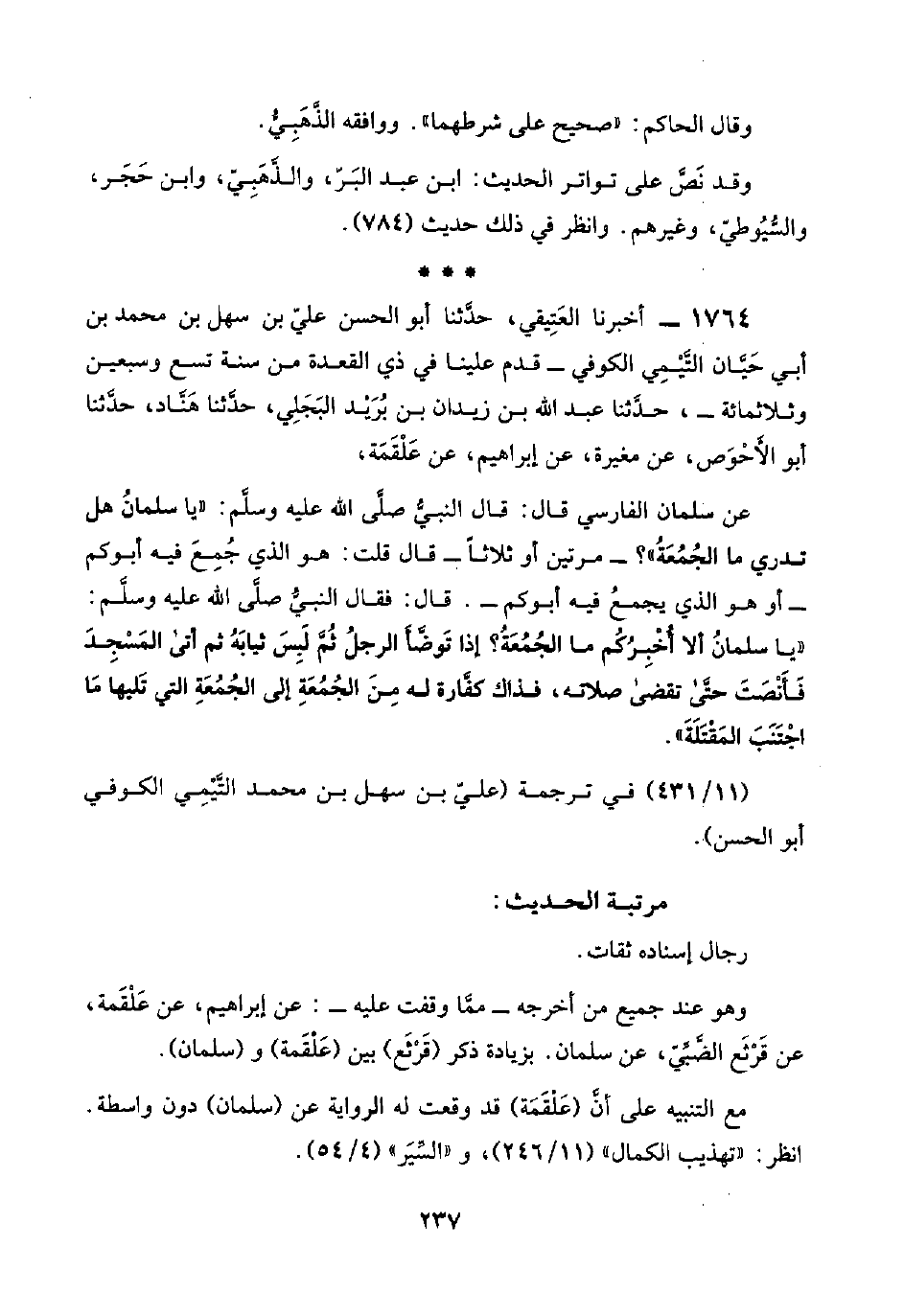١٧٦٤ - أخبرنا العَتِيقي، حدَّثنا أبو الحسن عليّ بن سهل بن محمد بن أبي حَيَّان التيمي الكوفي -قدم علينا في ذي القعدة من سنة تسع وسبعين وثلاثمائة-، حدَّثنا عبد اللَّه بن زيدان بن بُرَيْد البَجَلِي، حدَّثنا هَنَّاد، حدَّثنا أبو الأَحْوَص، عن مغيرة، عن إبراهيم، عن عَلْقَمَة،