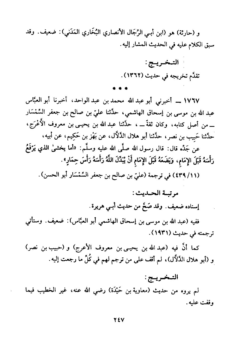 ١٧٦٧ - أخبرني أبو عبد اللَّه محمد بن عبد الواحد، أخبرنا أبو العبَّاس عبد اللَّه بن موسى بن إسحاق الهاشمي، حدَّثنا عليّ بن صالح بن جعفر السِّمْسَار -من أصل كتابه، وكان ثقةً-، حدَّثنا عبد اللَّه بن يحيى بن معروف الأَعْرَج، حدَّثنا حَبِيب بن نصر، حدَّثنا أبو هلال الدَّلَّال، عن بَهْز بن حَكِيم، عن أبيه،