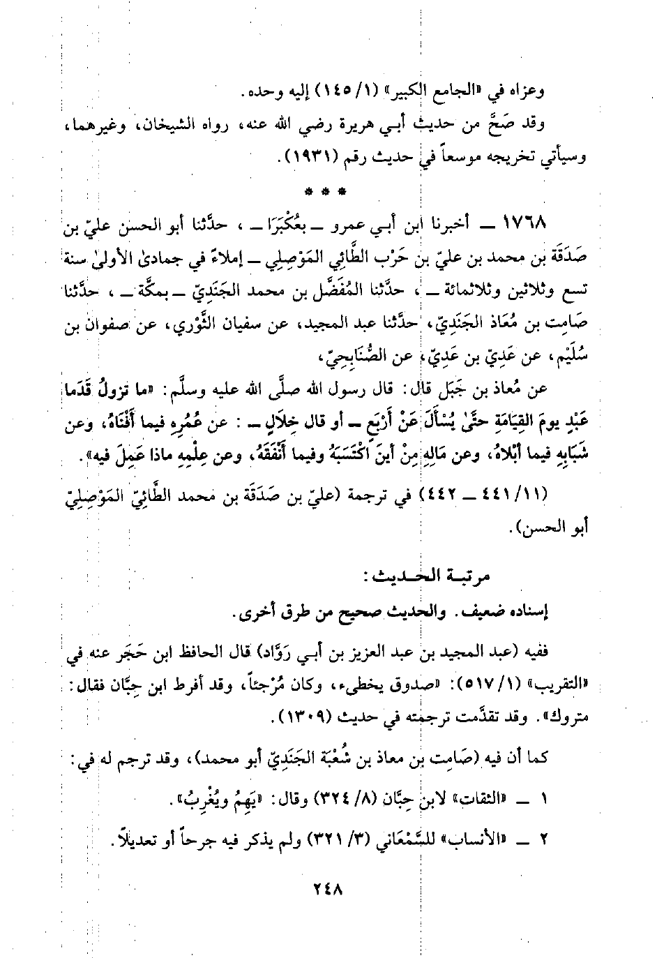 ١٧٦٨ - أخبرنا ابن أبي عمرو -بعُكْبَرَا-، حدَّثنا أبو الحسن عليّ بن صَدَقَة بن محمد بن عليّ بن حَرْب الطَّائِي المَوْصِلِي -إملاءً في جمادى الأولى سنة تسع وثلاثين وثلاثمائة-، حدَّثنا المُفَضَّل بن محمد الجَنَدِيّ -بمكَّة-، حدَّثنا صَامِت بن مُعَاذ الجَنَدِيّ، حدَّثنا عبد المجيد، عن سفيان الثَّوْري، عن صفوان بن سُلَيْم، عن عَدِيّ بن عَدِيّ عن الصُّنَابِحِيّ،