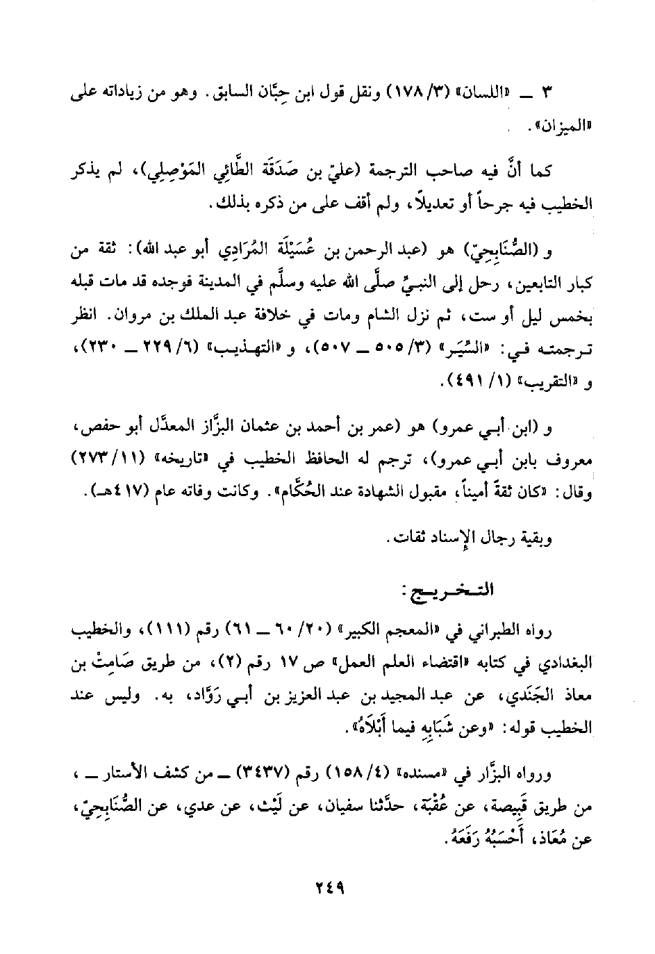 كما أنَّ فيه صاحب الترجمة (عليّ بن صَدَقَة الطَّائِي المَوْصِلِي)، لم يذكر الخطيب فيه جرحًا أو تعديلًا، ولم أقف على من ذكره بذلك.