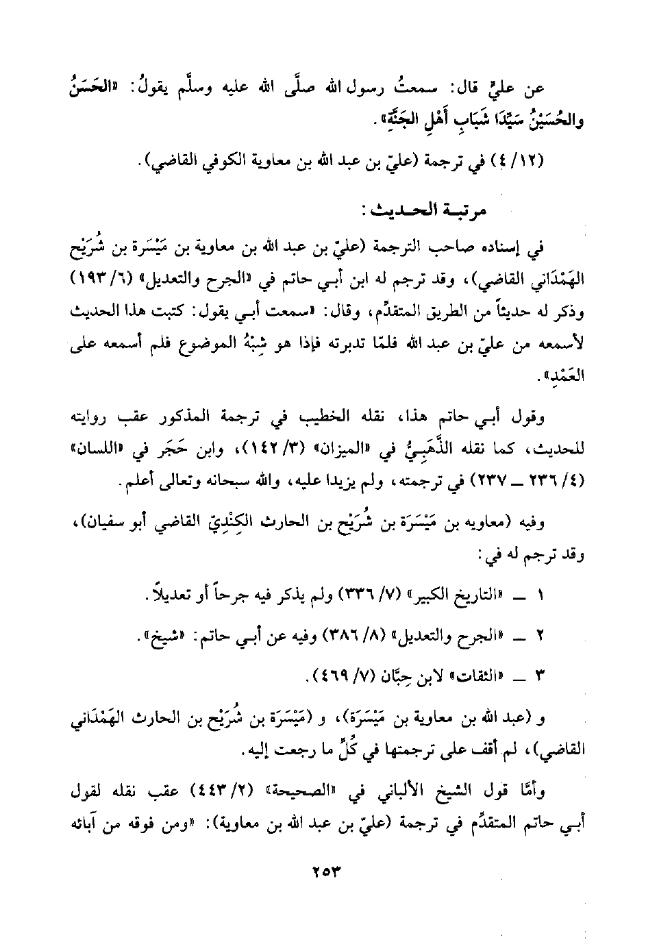 وأما قول الشيخ الألباني في "الصحيحة" (٢/ ٤٤٣) عقب نقله لقول أبي حاتم المتقدِّم في ترجمة (عليّ بن عبد اللَّه بن معاوية): "ومن فوقه من آبائه