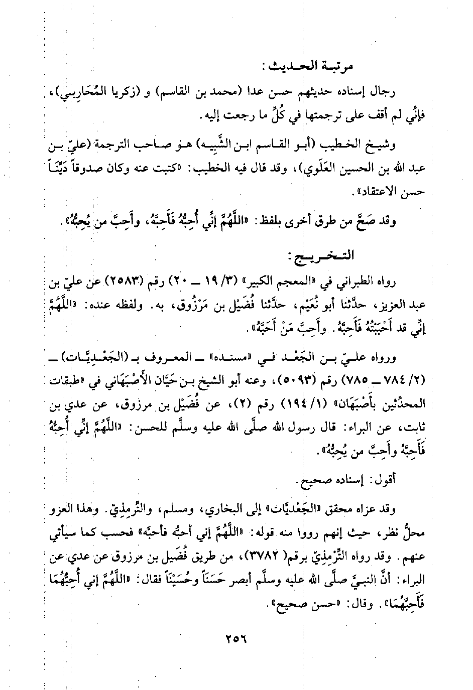 ورواه عليّ بن الجَعْد في "مسنده" -المعروف بـ (الجَعْدِيَّات) - (٢/ ٧٨٤ - ٧٨٥) رقم (٥٠٩٣)، وعنه أبو الشيخ بن حَيَّان الأَصْبَهَاني في "طبقات المحدِّثين بأَصْبَهَان" (١/ ١٩٤) رقم (٢)، عن فُضَيْل بن مرزوق، عن عدي بن ثابت، عن البراء: قال رسول اللَّه صلَّى اللَّه عليه وسلَّم للحسن: "اللَّهُمَّ إنِّي أُحِبُّهُ فَأَحِبَّهُ وأَحِبَّ من يُحِبُّهُ".