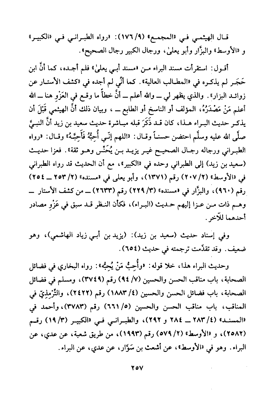 أقول: استقرأت مسند البراء من "مسند أبي يعلى" فلم أجده، كما أنَّ ابن حَجَر لم يذكره في "المطالب العالية". كما أنِّي لم أجده في "كشف الأستار عن زوائد البزار". والذي يظهر لي -واللَّه أعلم- أنَّ خطأً ما وقع في العَزْوِ هنا -اللَّه أعلم مَنْ مَصْدَرُهُ، المؤلف أو الناسخ أو الطابع-، وبيان ذلك أنَّ الهيثمي قَبْلَ أن يذكر حديث البراء هذا، كان قد ذَكَرَ قبله مباشرة حديث سعيد بن زيد أنَّ النبيَّ صلَّى اللَّه عليه وسلَّم احتضن حسنًا وقال: "اللهم إنّي أُحِبُّهُ فَأَحِبَّهُ" وقال: "رواه الطبراني ورجاله رجال الصحيح غير يزيد بن يُحَنِّس وهو ثقة". فعزا حديث (سعيد بن زيد) إلى الطبراني وحده في "الكبير"، مع أن الحديث قد رواه الطبراني في "الأوسط" (٢/ ٢٠٧) رقم (١٣٧١)، وأبو يعلى في "مسنده" (٢/ ٢٥٣ - ٢٥٤) رقم (٩٦٠)، والبزَّار في "مسنده" (٣/ ٢٢٩) رقم (٢٦٣٣) -من كشف الأستار- وهم ذات من عزا إليهم حديث (البراء)، فكأن النظر قد سبق في عَزْوِ مصادر أحدهما للآخر.