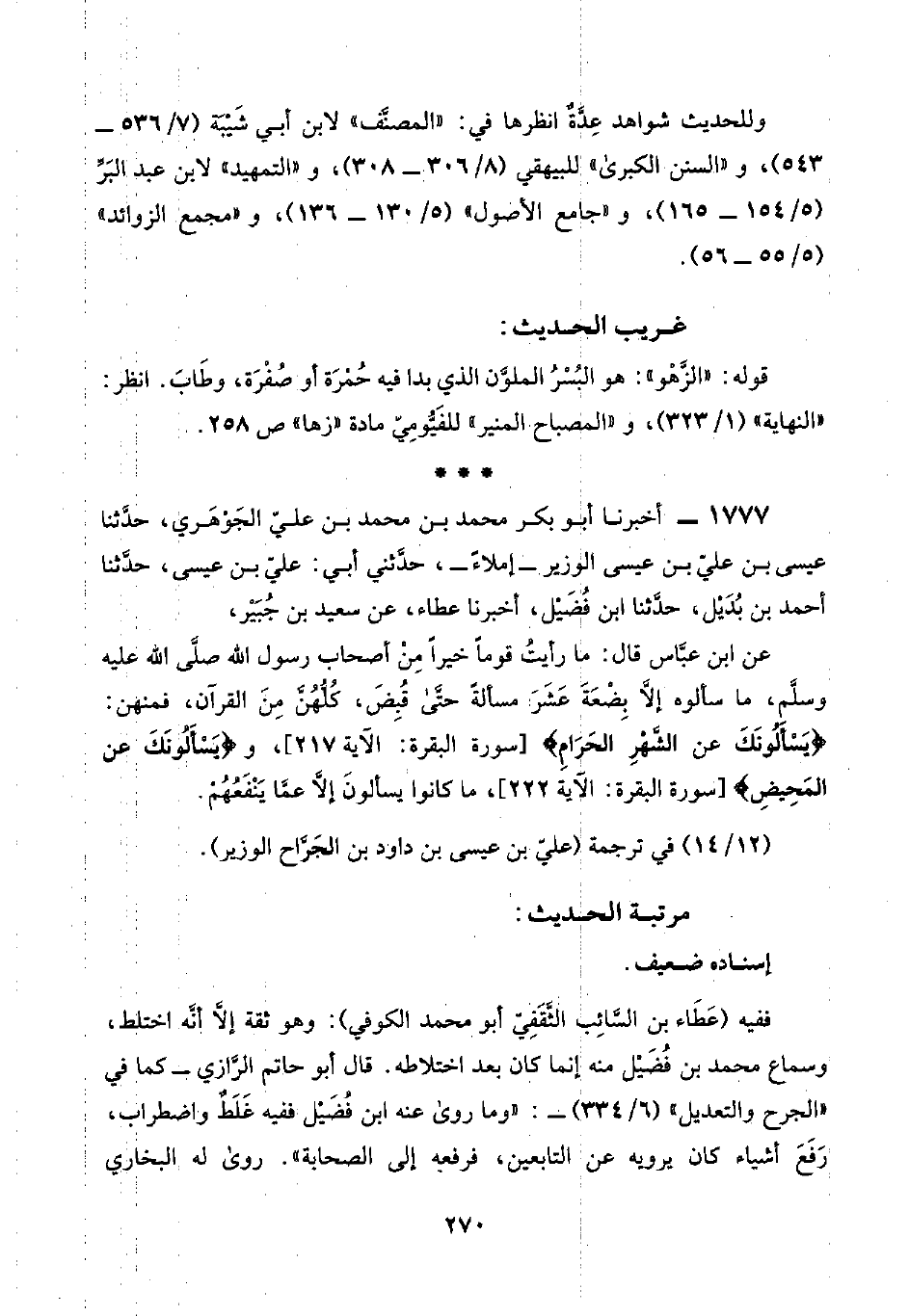 ١٧٧٧ - أخبرنا أبو بكر محمد بن محمد بن عليّ الجَوْهَري، حدَّثنا عيسى بن عليّ بن عيسى الوزير -إملاءً-، حدَّثني أبي: عليّ بن عيسى، حدَّثنا أحمد بن بُدَيْل، حدَّثنا ابن فُضَيْل، أخبرنا عطاء، عن سعيد بن جُبَيْر،