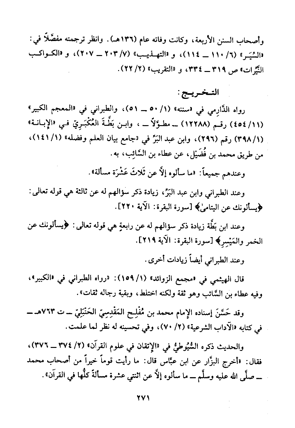 والحديث ذكره السُّيُوطيُّ في "الإِتقان في علوم القرآن" (٢/ ٣٧٤ - ٣٧٦)، فقال: "أخرج البزَّار عن ابن عبَّاس قال: ما رأيت قومًا خيرًا من أصحاب محمد -صلَّى اللَّه عليه وسلَّم- ما سألوه إلَّا عن اثنتي عشرة مسألةً كلُّها في القرآن".