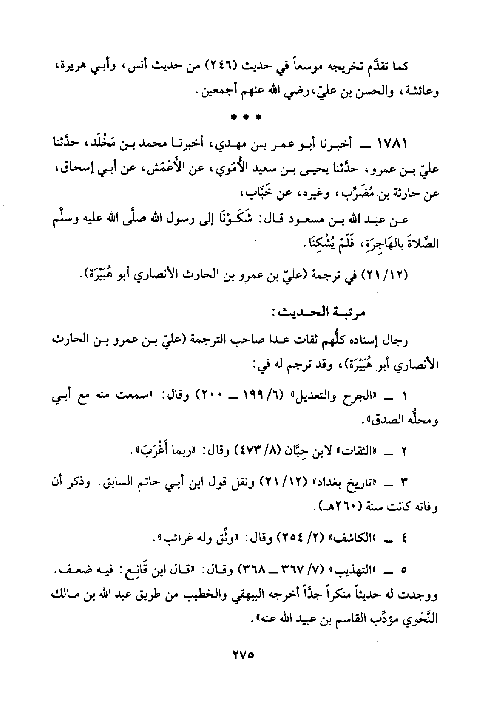 ١٧٨١ - أخبرنا أبو عمر بسن مهدي، أخبرنا محمد بن مَخْلَد، حدَّثنا عليّ بن عمرو، حدَّثنا يحيى بن سعيد الأُمَوي، عن الأَعْمَش، عن أبي إسحاق، عن حارثة بن مُضَرِّب، وغيره، عن خَبَّاب،