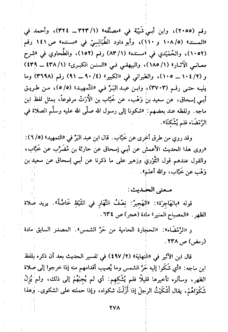 رقم (٢٠٥٥)، وابن أبي شَيْبَة في "مصنَّفه" (١/ ٣٢٣ - ٣٢٤)، وأحمد في "المسند" (٥/ ١٠٨ و ١١٠)، وأبو داود الطَّيَالِسِيّ في "مسنده" ص ١٤١ رقم (١٠٥٢)، والحُمَيْدي في "مسنده" (١/ ٨٣) رقم (١٥٢)، والطَّحاوي في "شرح معاني الآثار" (١/ ١٨٥)، والبيهقي في "السنن الكبرى" (١/ ٤٣٨ - ٤٣٩) و (٢/ ١٠٤ - ١٠٥)، والطبراني في "الكبير" (٤/ ٩٠ - ٩١) رقم (٣٦٩٨) وما يليه حتى رقم (٣٧٠٣)، وابن عبد البَرِّ في "التَّمهيد" (٥/ ٥)، من طريق أبي إسحاق، عن سعيد بن وَهْب، عن خَبَّاب بن الأَرَتّ مرفوعًا، بمثل لفظ ابن ماجه. ولفظه عند بعضهم: "شكونا إلى رسول اللَّه صلَّى اللَّه عليه وسلَّم الصلاة في الرَّمْضَاء فلم يُشْكِنَا".