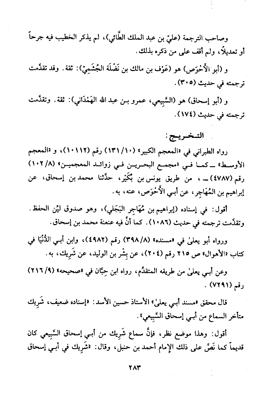 قال محقق "مسند أبي يعلى" الأستاذ حسين الأسد: "إسناده ضعيف، شَرِيك متأخر السماع من أبي إسحاق السَّبِيعي".