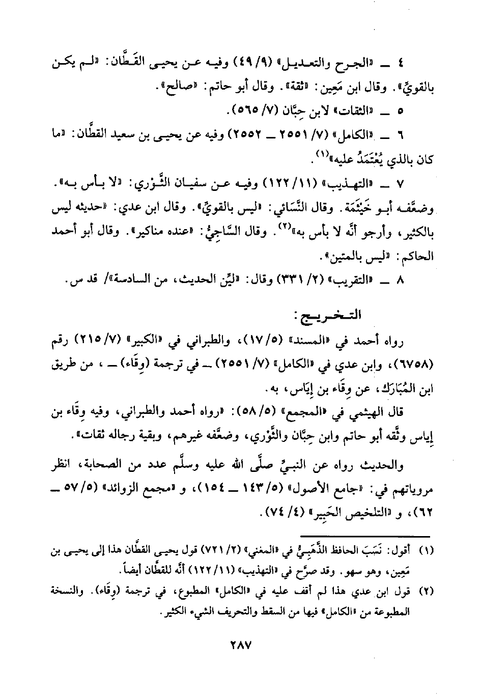 ٦ - "الكامل" (٧/ ٢٥٥١ - ٢٥٥٢) وفيه عن يحيى بن سعيد القطَّان: "ما كان بالذي يُعْتَمَد عليه" (¬١).