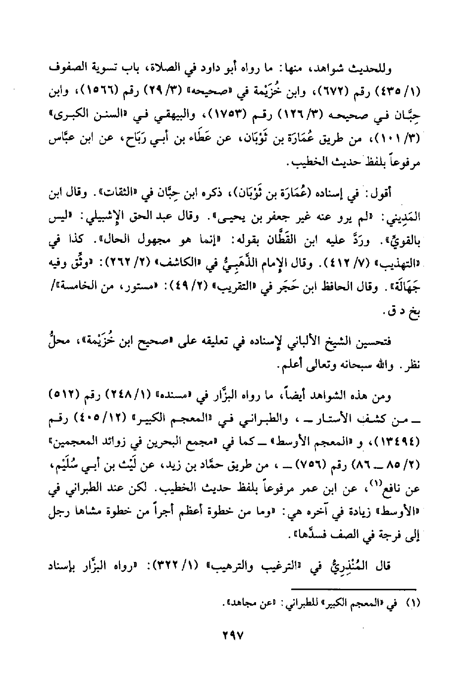 ومن هذه الشواهد أيضًا، ما رواه البزَّار في "مسنده" (١/ ٢٤٨) رقم (٥١٢) -من كشف الأستار-، والطبراني في "المعجم الكبير" (١٢/ ٤٠٥) رقم (١٣٤٩٤)، و"المعجم الأوسط" -كما في "مجمع البحرين في زوائد المعجمين" (٢/ ٨٥ - ٨٦) رقم (٧٥٦) -، من طريق حمَّاد بن زيد، عن لَيْث بن أبي سُلَيْم، عن نافع (¬١)، عن ابن عمر مرفوعًا بلفظ حديث الخطيب. لكن عند الطبراني في "الأوسط" زيادة في آخره هي: "وما من خطوة أعظم أجرًا من خطوة مشاها رجل إلى فرجة في الصف فسدَّها".