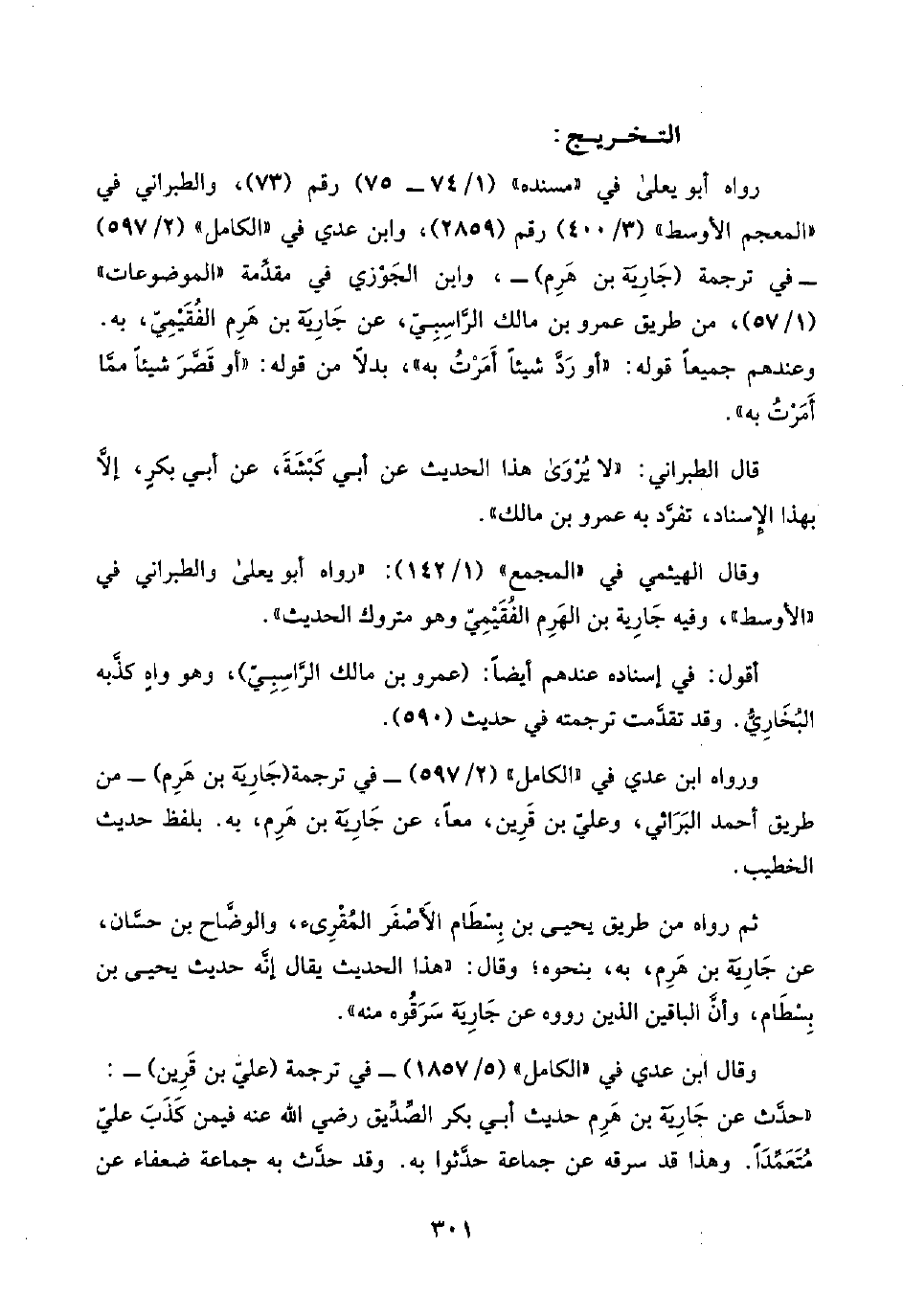 رواه أبو يعلى في "مسنده" (١/ ٧٤ - ٧٥) رقم (٧٣)، والطبراني في "المعجم الأوسط" (٣/ ٤٠٠) رقم (٢٨٥٩)، وابن عدي في "الكامل" (٢/ ٥٩٧) -في ترجمة (جَاريَة بن هَرِم) -، وابن الجَوْزي في مقدِّمة "الموضوعات" (١/ ٥٧)، من طريق عمرو بن مالك الرَّاسِبِيّ، عن جَارِيَة بن هَرِم الفُقَيْمِيّ، به. وعندهم جميعًا قوله: "أو رَدَّ شيئًا أَمَرْتُ به"، بدلًا من قوله: "أو قَصَّرَ شيئًا ممَّا أَمَرْتُ به".