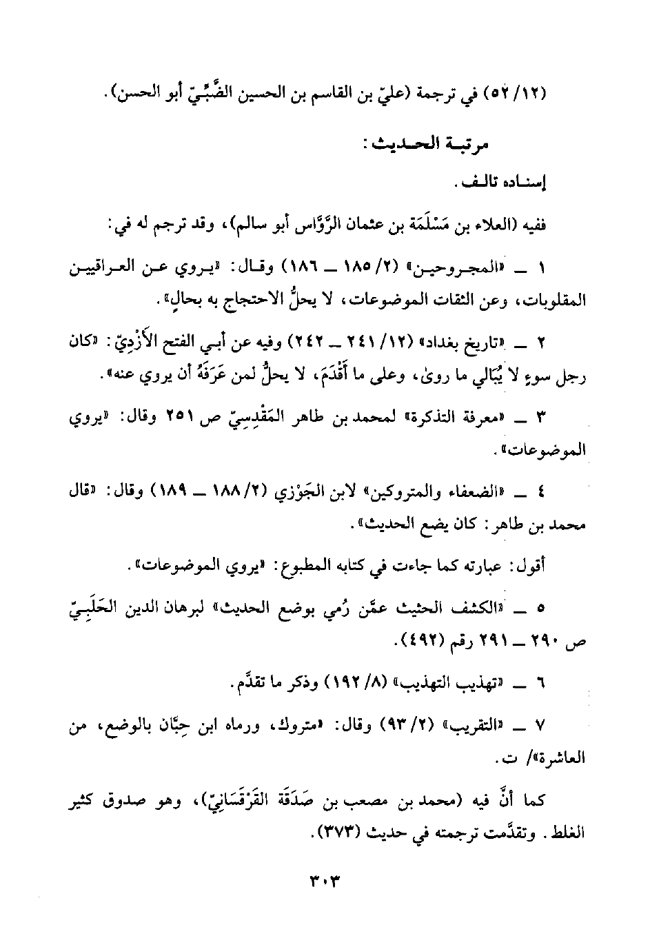 ٢ - "تاريخ بغداد" (١٢/ ٢٤١ - ٢٤٢) وفيه عن أبي الفتح الأَزْدِيّ: "كان رجل سوءٍ لا يُبَالي ما روى، وعلى ما أَقْدَمَ، لا يحلُّ لمن عَرَفَهُ أنَّ يروي عنه".