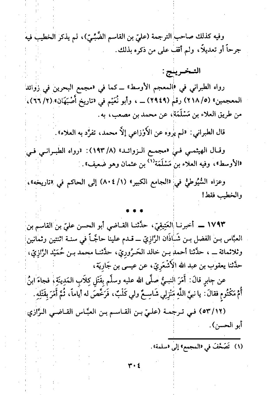 ١٧٩٣ - أخبرنا العَتِيقِيّ، حدَّثنا القاضي أبو الحسن عليّ بن القاسم بن العبَّاس بن الفضل بن شَاذَان الرَّازي -قدم علينا حاجًّا في سنة اثنتين وثمانين وثلاثمائة-، حدَّثنا أحمد بن خالد الحَرُورِيّ، حدَّثنا محمد بن حُمَيْد الرَّازِيّ، حدَّثنا يعقوب بن عبد اللَّه الأَشْعَرِيّ، عن عيسى بن جَارِيَة،