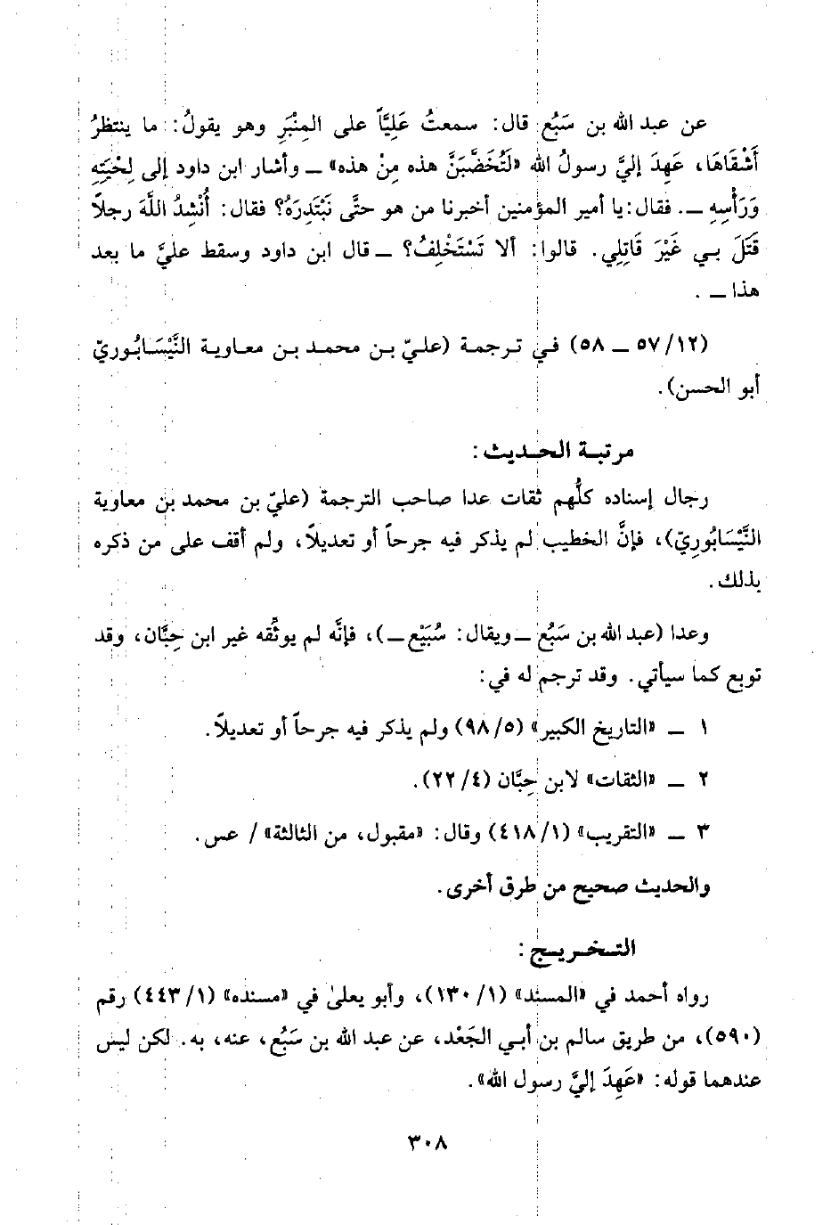 عن عبد اللَّه بن سَبُع قال: سمعتُ عَلِيًّا على المِنْبَرِ وهو يقولُ: ما ينتظرُ أَشْقَاهَا، عَهِدَ إليَّ رسولُ اللَّه "لَتُخَضَّبَنَّ هذه مِنْ هذه" -وأشار ابن داود إلى لِحْيَتِهِ وَرَأْسِهِ-. فقال: يا أمير المؤمنين أخبرنا من هو حتَّى نَبْتَدِرَهُ؟ فقال: أُنْشِدُ اللَّهَ رجلًا قَتَلَ بي غَيْرَ قَاتِلِي. قالوا: ألا تَسْتَخْلِفُ؟ -قال ابن داود وسقط عليَّ ما بعد هذا-.