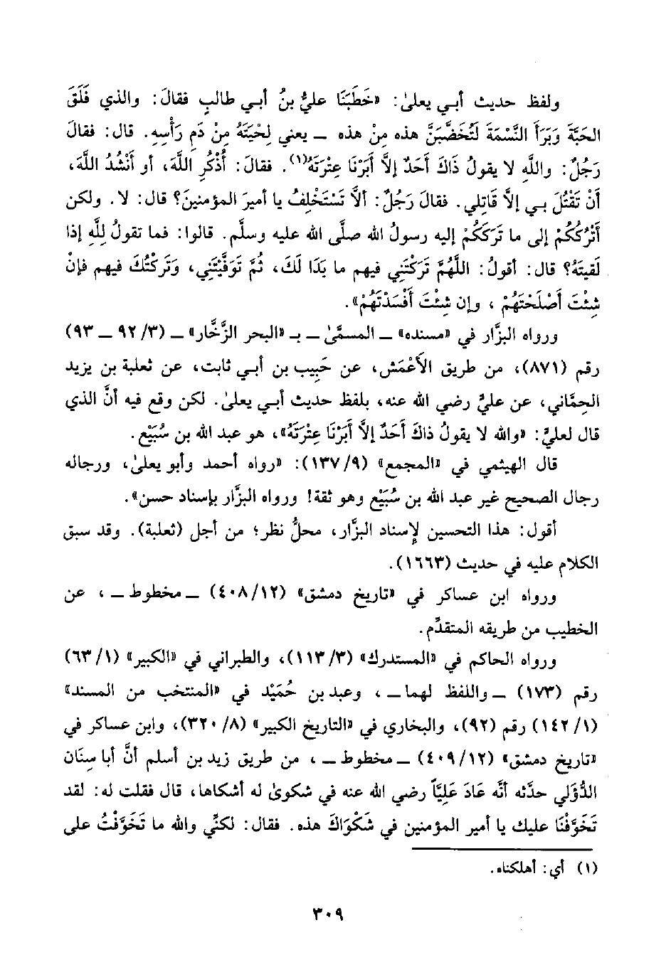 ورواه البزَّار في "مسنده" -المسمَّى - بـ "البحر الزَّخَّار"- (٣/ ٩٢ - ٩٣) رقم (٨٧١)، من طريق الأَعْمَش، عن حَبِيب بن أبي ثابت، عن ثعلبة بن يزيد الحِمَّاني، عن عليٍّ رضي اللَّه عنه، بلفظ حديث أبي يعلى. لكن وقع فيه أنَّ الذي قال لعليٍّ: "واللَّه لا يقولُ ذاكَ أَحَدٌ إلَّا أَبَرْنَا عِتْرَتَهُ"، هو عبد اللَّه بن سُبَيْع.