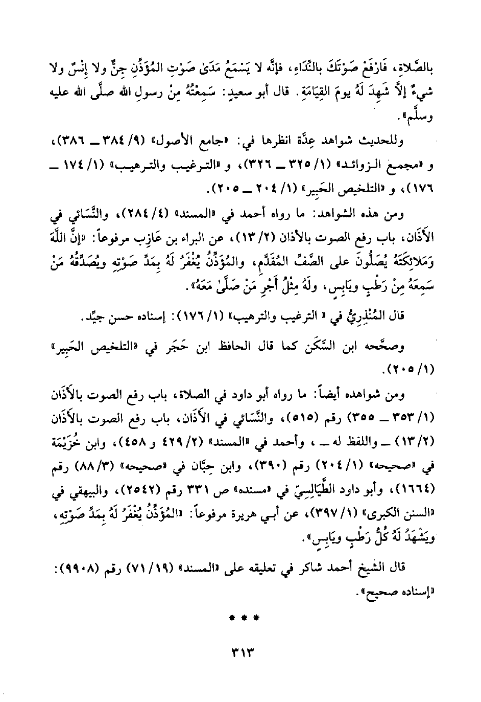 ومن هذه الشواهد: ما رواه أحمد في "المسند" (٤/ ٢٨٤)، والنَّسَائي في الأَذَان، باب رَفَعَ الصوت بالأذان (٢/ ١٣)، عن البراء بن عَازِب مرفوعًا: "إنَّ اللَّهَ وَمَلائِكَتَهُ يُصَلُّونَ على الصَّفِّ المُقَدَّمِ، والمُؤَذِّنُ يُغْفَرُ لَهُ بِمَدِّ صَوْتِهِ ويُصَدِّقُهُ مَنْ سَمِعَهُ مِنْ رَطْبٍ ويَابِسٍ، ولَهُ مِثْلُ أَجْرِ مَنْ صَلَّى مَعَهُ".