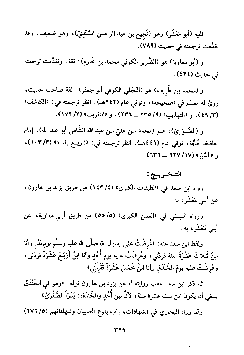 ثم ذكر ابن سعد عقب روايته له عن يزيد بن هارون قوله: "وهو في الخَنْدَق ينبغي أن يكون ابن ست عشرة سنة، لأنَّ بين أُحُدٍ والخَنْدَق: بَدْرًا الصُّغْرَى".