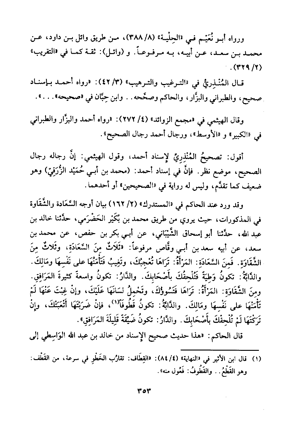 وقد ورد عند الحاكم في "المستدرك" (٢/ ١٦٢) بيان أوجه السَّعَادة والشَّقَاوة في المذكورات، حيث يروي من طريق محمد بن بُكَيْر الحَضْرَمي، حدَّثنا خالد بن عبد اللَّه، حدَّثنا أبو إسحاق الشَّيْبَاني، عن أبي بكر بن حفص، عن محمد بن سعد، عن أبيه سعد بن أبي وقَّاص مرفوعًا: "ثَلَاثٌ مِنَ السَّعَادَةِ، وثَلاثٌ مِنَ الشَّقَاوَةِ. فَمِنَ السَّعَادَةِ: المَرْأَةُ: تَرَاهَا تُعْجِبُكَ، وتَغِيبُ فَتَأْمَنُهَا على نَفْسِهَا ومَالِكَ. والدَّابَّةُ: تكونُ وَطِيَةً فَتُلْحِقُكَ بأَصْحَابِكَ. والدَّارُ: تكونُ واسعةً كثيرةَ المَرَافِقِ. ومِنَ الشَّقَاوَةِ: المَرْأَةُ: تَرَاهَا فَتَسُوؤُكَ، وتَحْمِلُ لسَانَهَا عَلَيْكَ، وإنْ غِبْتَ عَنْهَا لَمْ تَأْمَنْهَا على نَفْسِها ومَالِكَ. والدَّابَّةُ: تكونُ قَطُوفًا (¬١)، فإنْ ضَرَبْتَهَا أَتْعَبَتْكَ، وإِنْ تَرَكْتَهَا لَمْ تُلْحِقْكَ بأَصْحَابِكَ. والدَّارُ: تكونُ ضَيِّقَةً قَلِيلَةَ المَرَافِقِ".