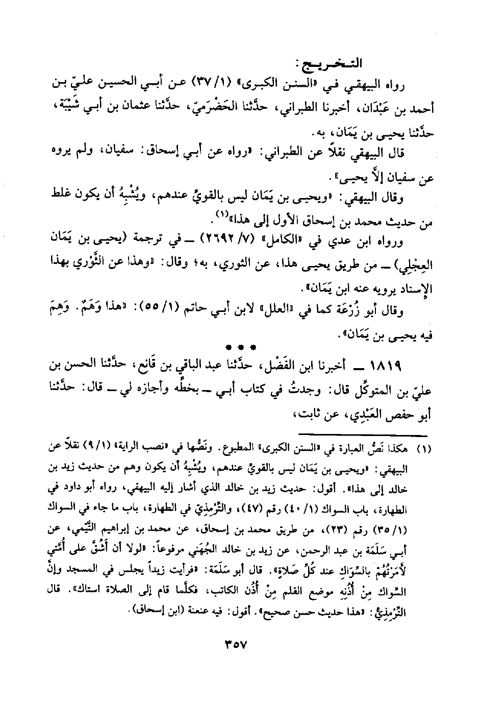 (¬١) هكذا نَصُّ العبارة في "السنن الكبرى" المطبوع. ونَصُّها في "نصب الراية" (١/ ٩) نقلًا عن البيهقي: "ويحيى بن يَمَان ليس بالقويِّ عندهم، ويُشْبِهُ أن يكون وهم من حديث زيد بن خالد إلى هذا". أقول: حديث زيد بن خالد الذي أشار إليه البيهقي، رواه أبو داود في الطهارة، باب السواك (١/ ٤٠) رقم (٤٧)، والتِّرْمِذِيّ في الطهارة، باب ما جاء في السواك (١/ ٣٥) رقم (٢٣)، من طريق محمد بن إسحاق، عن محمد بن إبراهيم التَّيْمي، عن أبي سَلَمَة بن عبد الرحمن، عن زيد بن خالد الجُهَني مرفوعًا: "لولا أن أَشُقَّ على أُمَّتي لأَمَرْتُهُمْ بالسِّوَاكِ عند كُلِّ صَلاةٍ". قال أبو سَلَمَة: "فرأيت زيدًا يجلس في المسجد وإنَّ السِّواك مِنْ أُذُنِهِ موضع القلم مِنْ أُذُن الكاتب، فكلَّما قام إلى الصلاة استاك". قال التِّرْمِذِيُّ: "هذا حديث حسن صحيح". أقول: فيه عنعنة (ابن إسحاق).