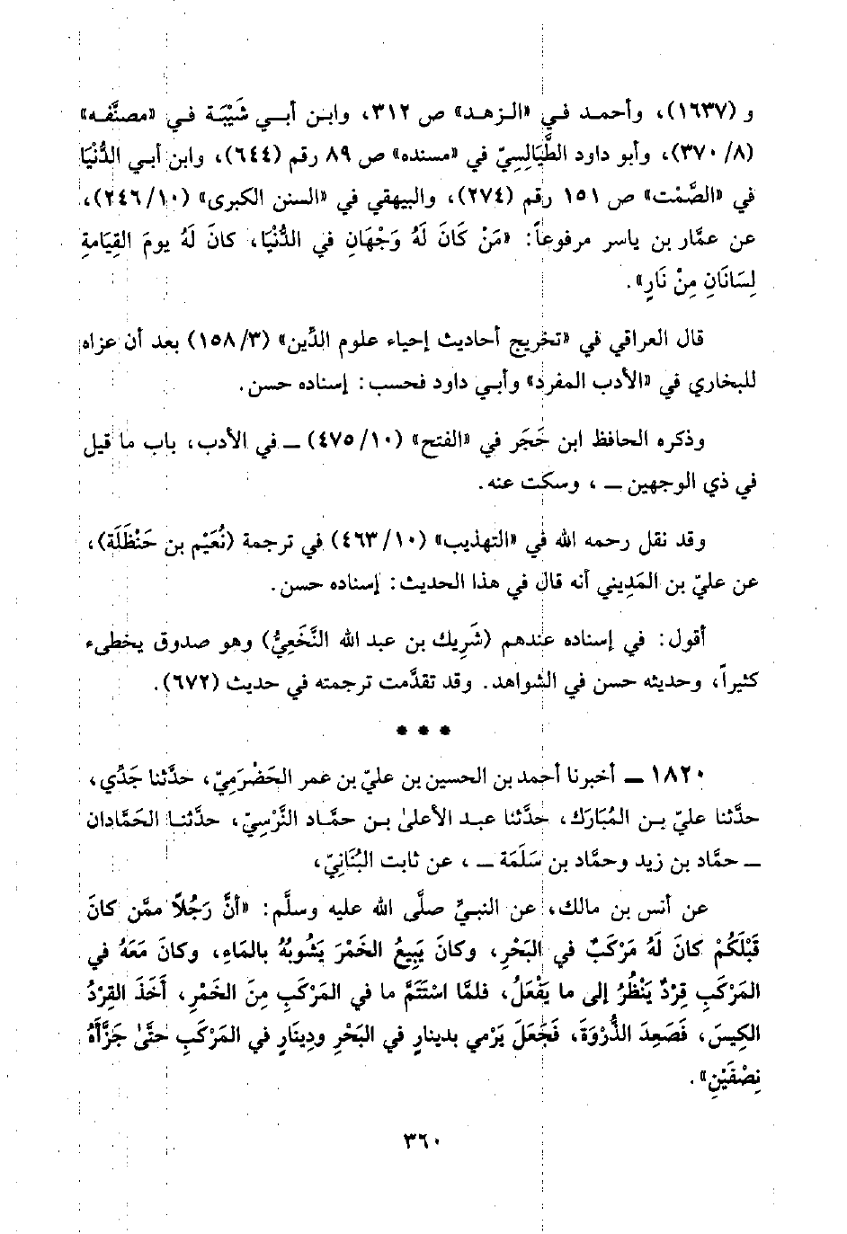 ١٨٢٠ - أخبرنا أحمد بن الحسين بن عليّ بن عمر الحَضْرَمِيّ، حدَّثنا جَدِّي، حدَّثنا عليّ بن المُبَارَك، حدَّثنا عبد الأعلى بن حمَّاد النَّرْسِيّ، حدَّثنا الحَمَّادان -حمَّاد بن زيد وحمَّاد بن سَلَمَة-، عن ثابت البُنَانِيّ،