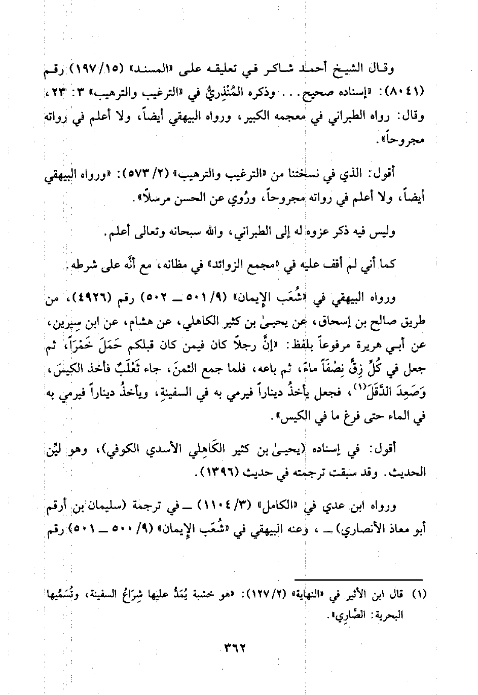 وقال الشيخ أحمد شاكر في تعليقه على "المسند" (١٥/ ١٩٧) رقم (٨٠٤١): "إسناده صحيح. . . وذكره المُنْذِريُّ في "الترغيب والترهيب" ٣/ ٢٣، وقال: رواه الطبراني في معجمه الكبير، ورواه البيهقي أيضًا، ولا أعلم في رواته مجروحًا".