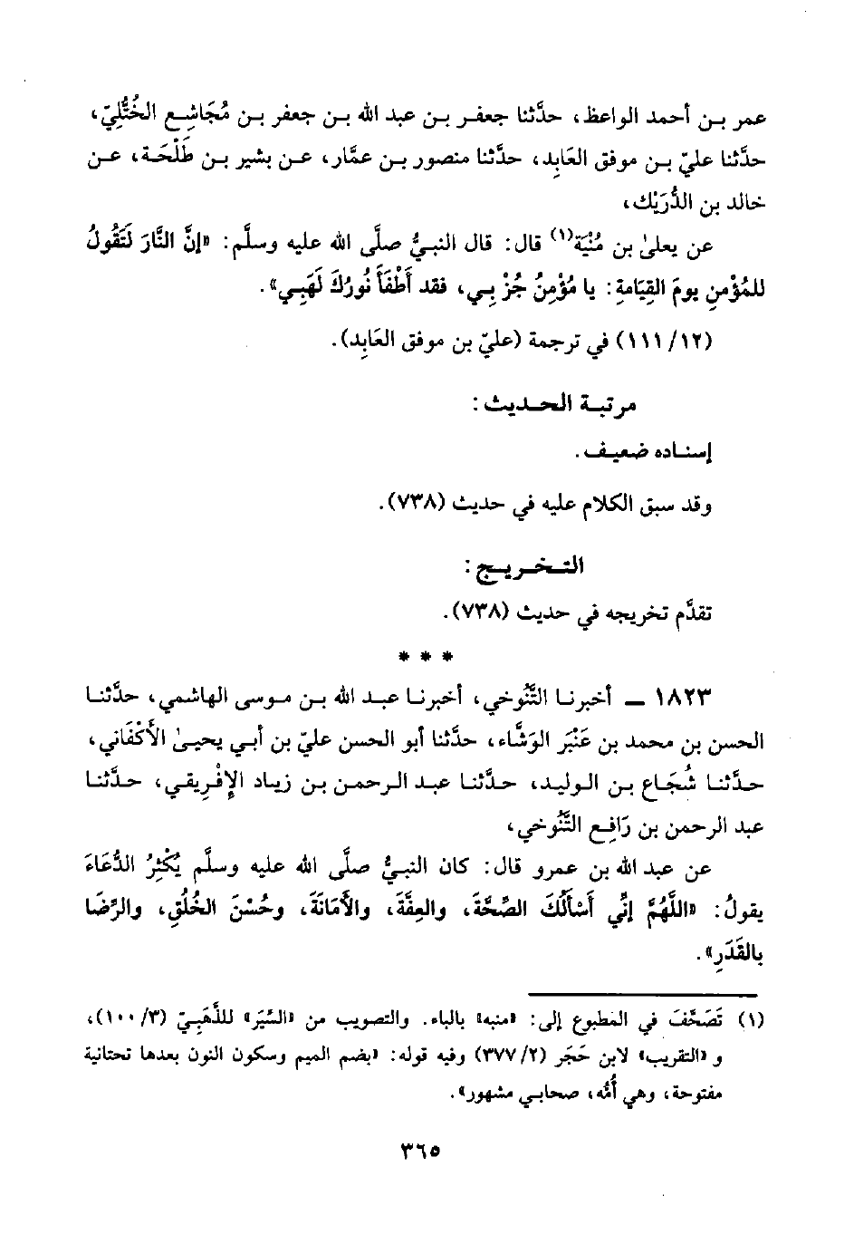 ١٨٢٣ - أخبرنا التَّنُوخي، أخبرنا عبد اللَّه بن موسى الهاشمي، حدَّثنا الحسن بن محمد بن عَنْبَر الوَشَّاء، حدَّثنا أبو الحسن عليّ بن أبي يحيى الأَكْفَاني، حدَّثنا شُجَاع بن الوليد، حدَّثنا عبد الرحمن بن زياد الإِفْرِيقي، حدَّثنا عبد الرحمن بن رَافِع التَّنُوخي،