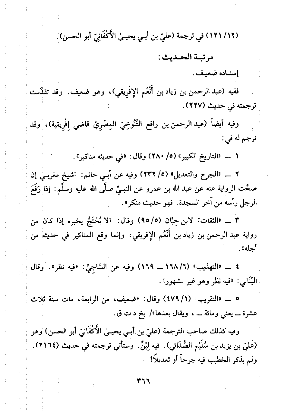 ٢ - "الجرح والتعديل" (٥/ ٢٣٢) وفيه عن أبي حاتم: "شيخ مغربي إن صحَّت الرواية عنه عن عبد اللَّه بن عمرو عن النبيِّ صلَّى اللَّه عليه وسلَّم: إذا رَفَعَ الرجل رأسه من آخر السجدة. فهو حديث منكر".