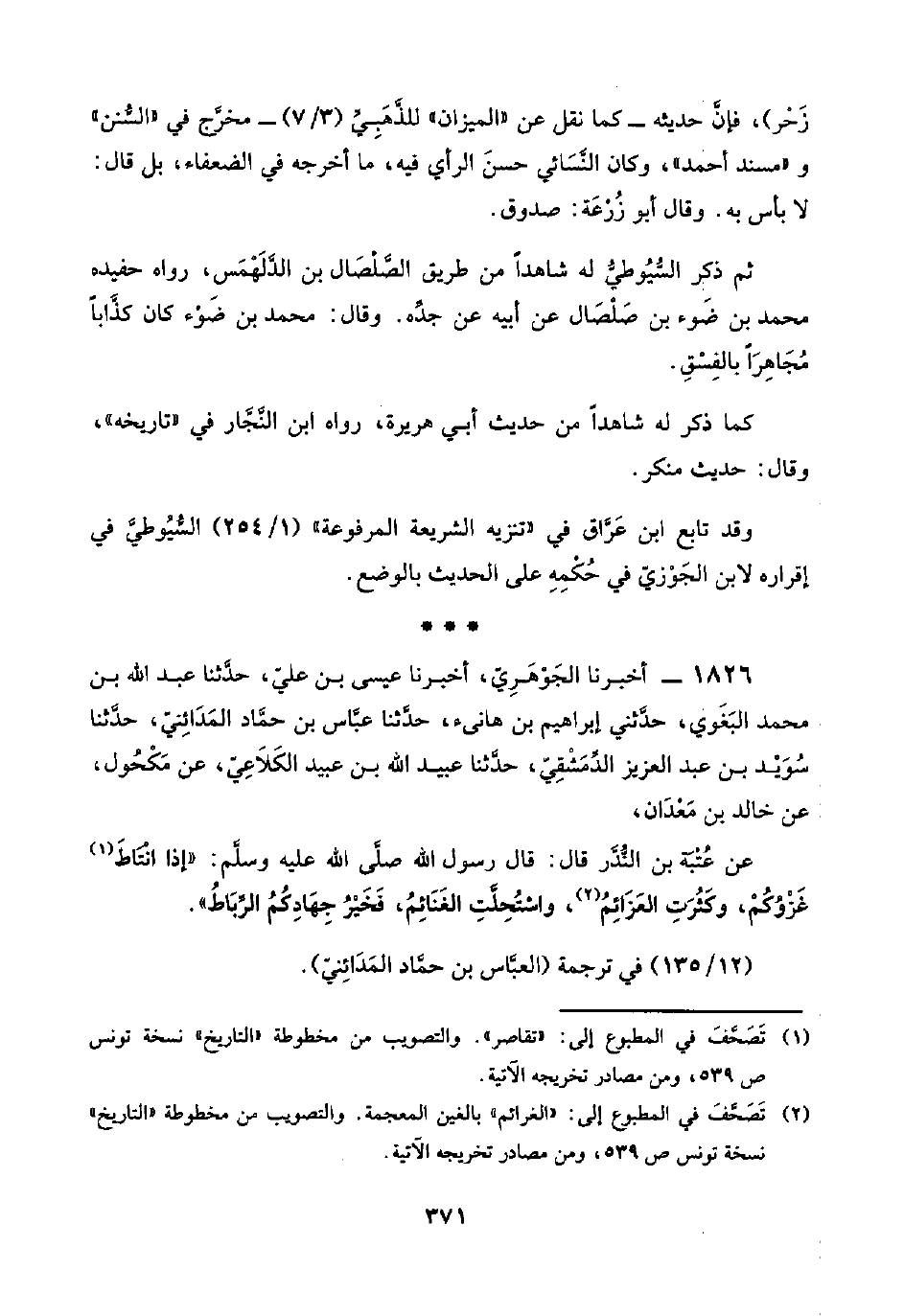 ١٨٢٦ - أخبرنا الجَوْهَرِيّ، أخبرنا عيسى بن عليّ، حدَّثنا عبد اللَّه بن محمد البَغَوي، حدَّثني إبراهيم بن هانئ، حدَّثنا عبَّاس بن حمَّاد المَدَائِنيّ، حدَّثنا سُوَيْد بن عبد العزيز الدِّمَشْقِيّ، حدَّثنا عبيد اللَّه بن عبيد الكَلَاعِيّ، عن مَكْحُول، عن خالد بن مَعْدَان،