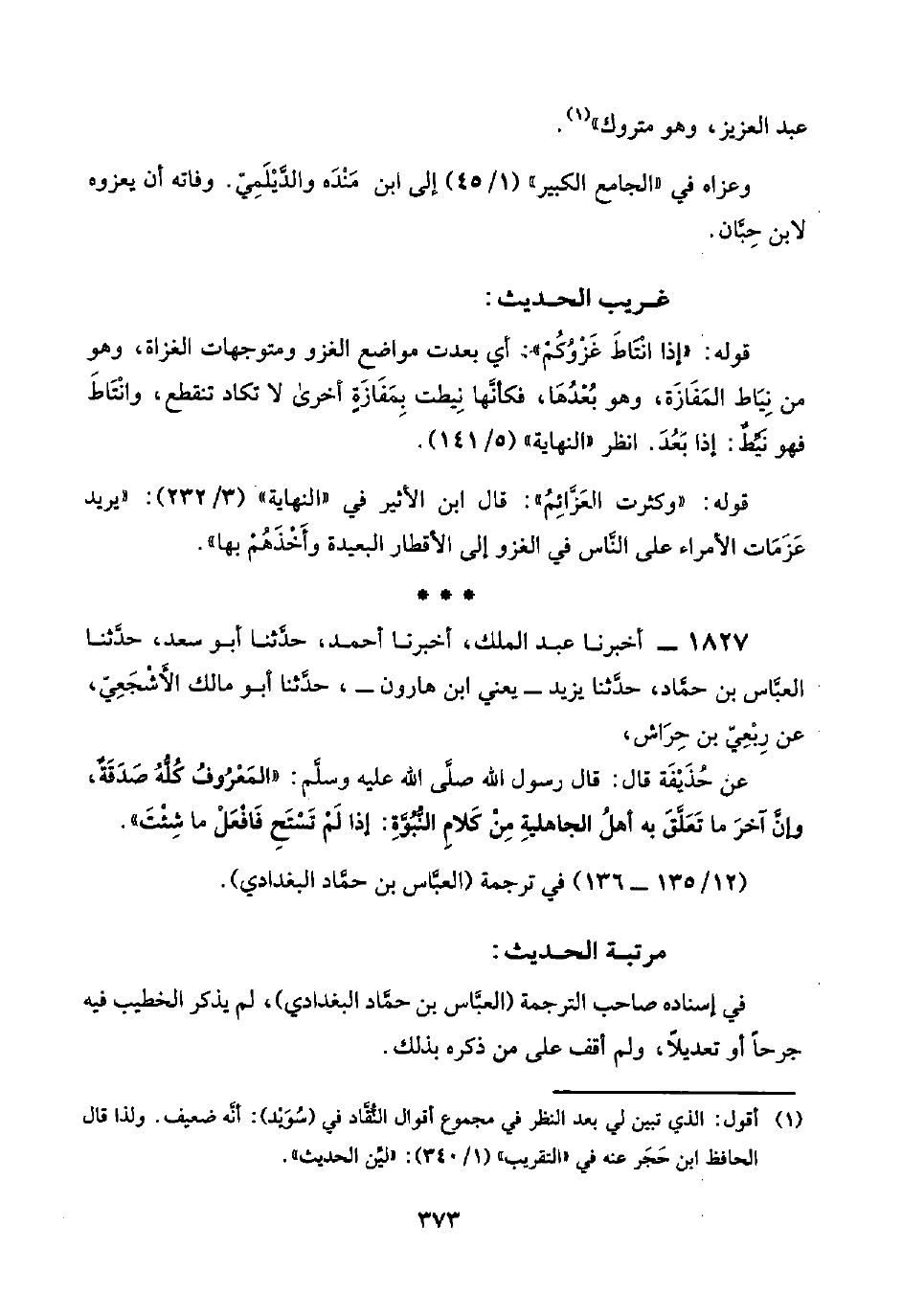 ١٨٢٧ - أخبرنا عبد الملك، أخبرنا أحمد، حدَّثنا أبو سعد، حدَّثنا العبَّاس بن حمَّاد، حدَّثنا يزيد -يعني ابن هارون-، حدَّثنا أبو مالك الأَشْجَعِيّ، عن رِبْعِيّ بن حِرَاش،