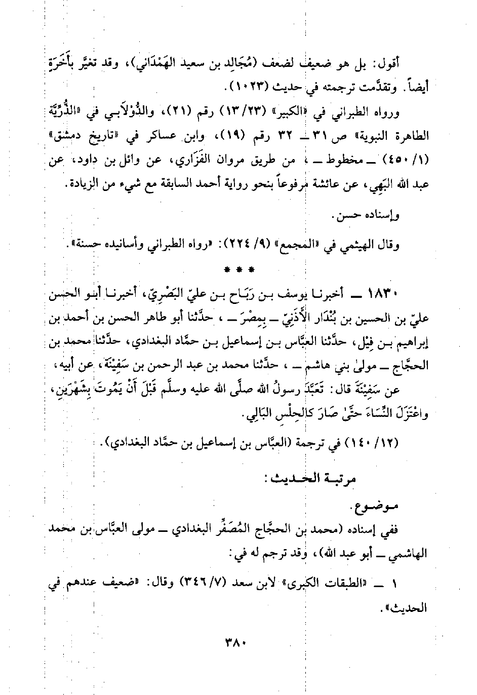 ١٨٣٠ - أخبرنا يوسف بن رَبَاح بن عليّ البَصْري، أخبرنا أبو الحسن عليّ بن الحسين بن بُنْدَار الأَذَنِيّ -بِمِصْرَ-، حدَّثنا أبو طاهر الحسن بن أحمد بن إبراهيم بن فِيْل، حدَّثنا العبَّاس بن إسماعيل بن حمَّاد البغدادي، حدَّثنا محمد بن الحجَّاج -مولى بني هاشم-، حدَّثنا محمد بن عبد الرحمن بن سَفِيْنَة، عن أبيه،