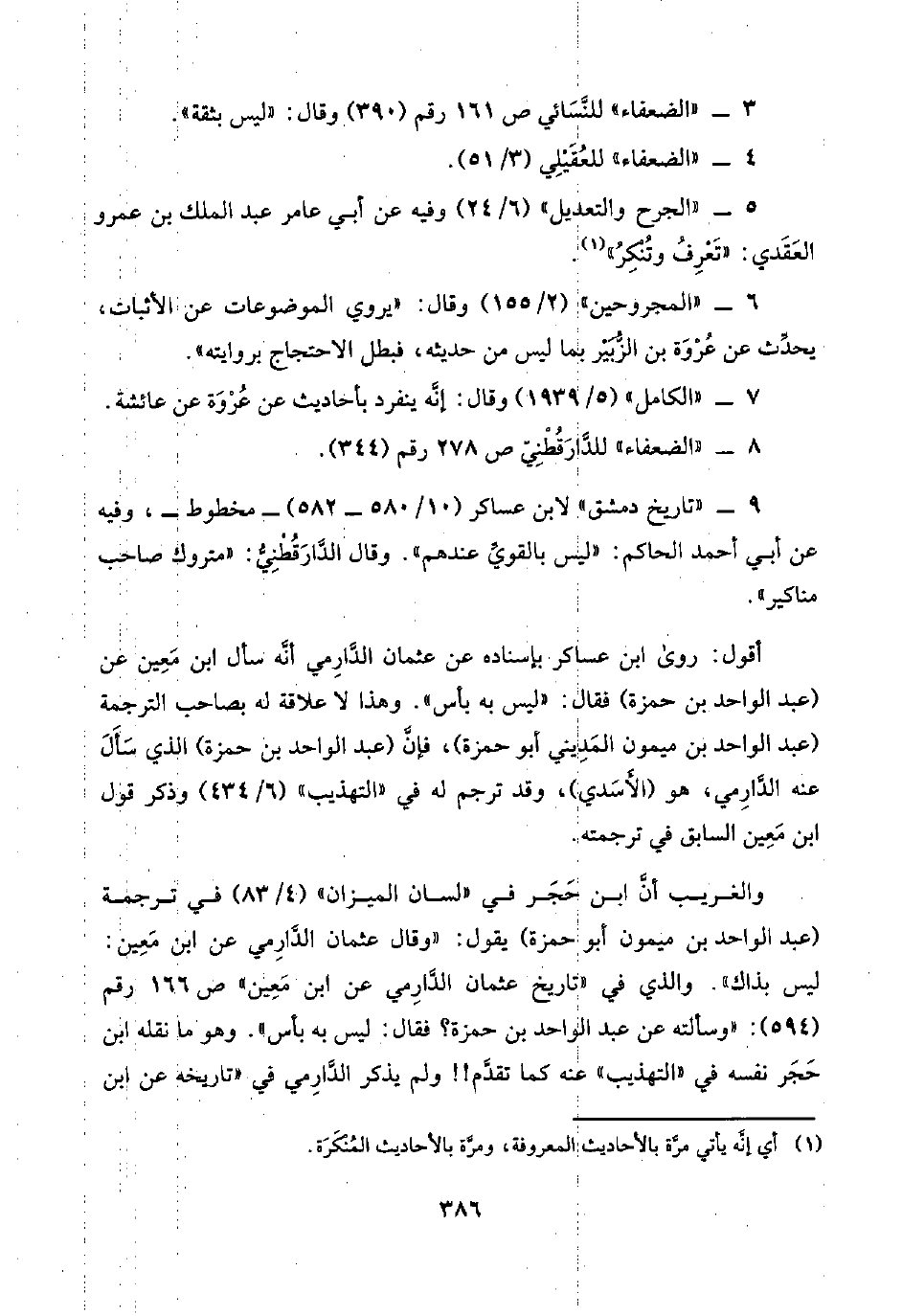 والغريب أنَّ ابن حجر في "لسان الميزان" (٤/ ٨٣) في ترجمة (عبد الواحد بن ميمون أبو حمزة) يقول: "وقال عثمان الدَّارِمي عن ابن مَعِين: ليس بذاك". والذي في "تاريخ عثمان الدَّارِمي عن ابن مَعِين" ص ١٦٦ رقم (٥٩٤): "وسألته عن عبد الواحد بن حمزة؟ فقال: ليس به بأس". وهو ما نقله ابن حَجَر نفسه في "التهذيب" عنه كما تقدَّم! ! ولم يذكر الدَّارِمي في "تاريخه عن ابن