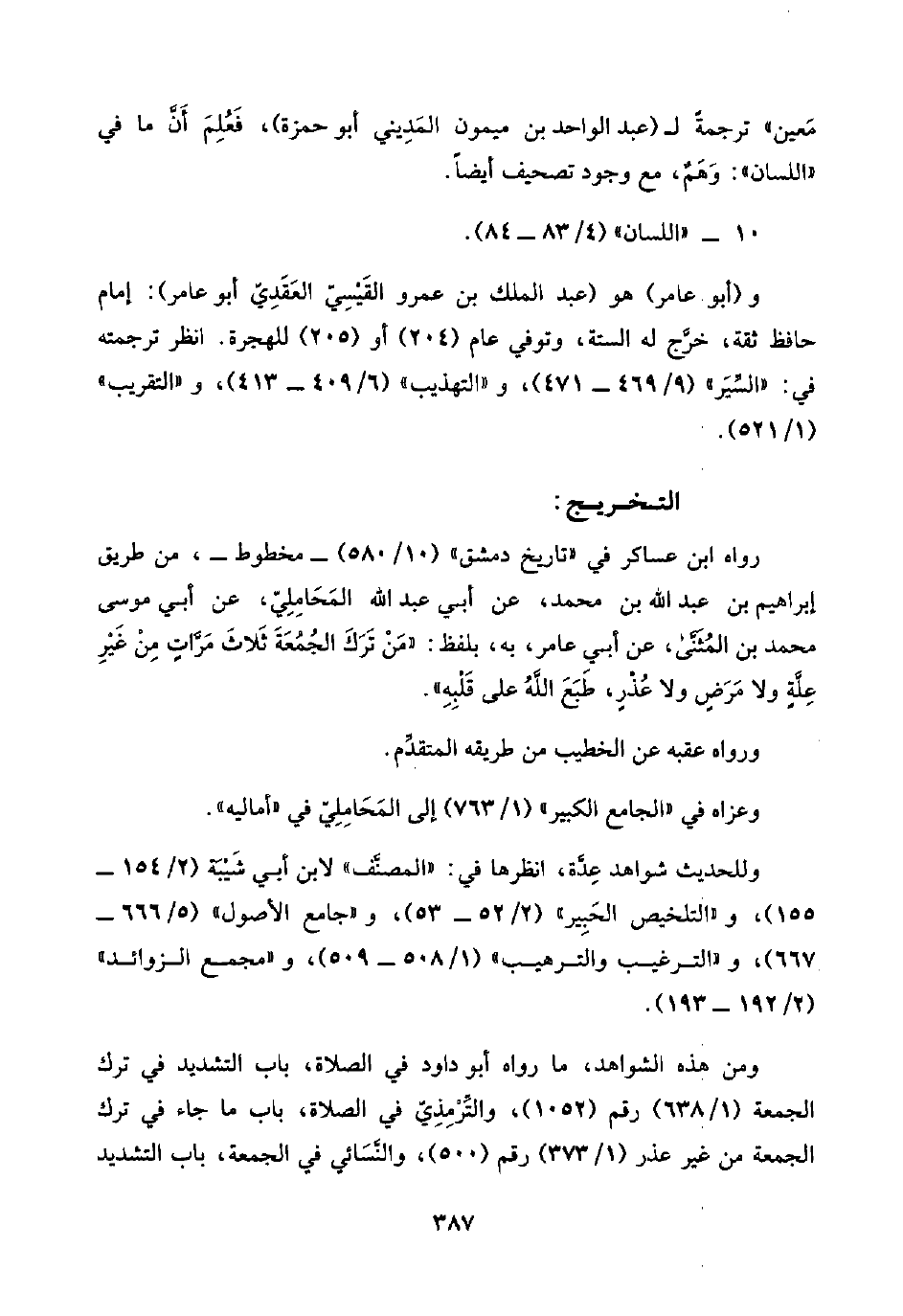 رواه ابن عساكر في "تاريخ دمشق" (١٠/ ٥٨٠) -مخطوط-، من طريق إبراهيم بن عبد اللَّه بن محمد، عن أبي عبد اللَّه المَحَامِلِيّ، عن أبي موسى محمد بن المُثَنَّى، عن أبي عامر، به، بلفظ: "مَنْ تَرَكَ الجُمُعَةَ ثَلاثَ مَرَّاتٍ مِنْ غَيْرِ عِلَّةٍ ولا مَرَضٍ ولا عُذْرٍ، طَبَعَ اللَّهُ على قَلْبِهِ".
