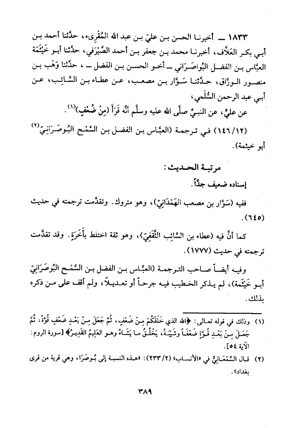 ١٨٣٣ - أخبرنا الحسن بن عليّ بن عبد اللَّه المُقْرِئ، حدَّثنا أحمد بن أبي بكر العَلَّاف، أخبرنا محمد بن جعفر بن أحمد الصَّيْرَفي، حدَّثنا أبو خَيْثَمَة العبَّاس بن الفضل البُواصَرَاني -أخو الحسن بن الفضل-، حدَّثنا وَهْب بن منصور الورَّاق، حدَّثنا سَوَّار بن مصعب، عن عطاء بن السَّائِب، عن أبي عبد الرحمن السُّلَمي،
