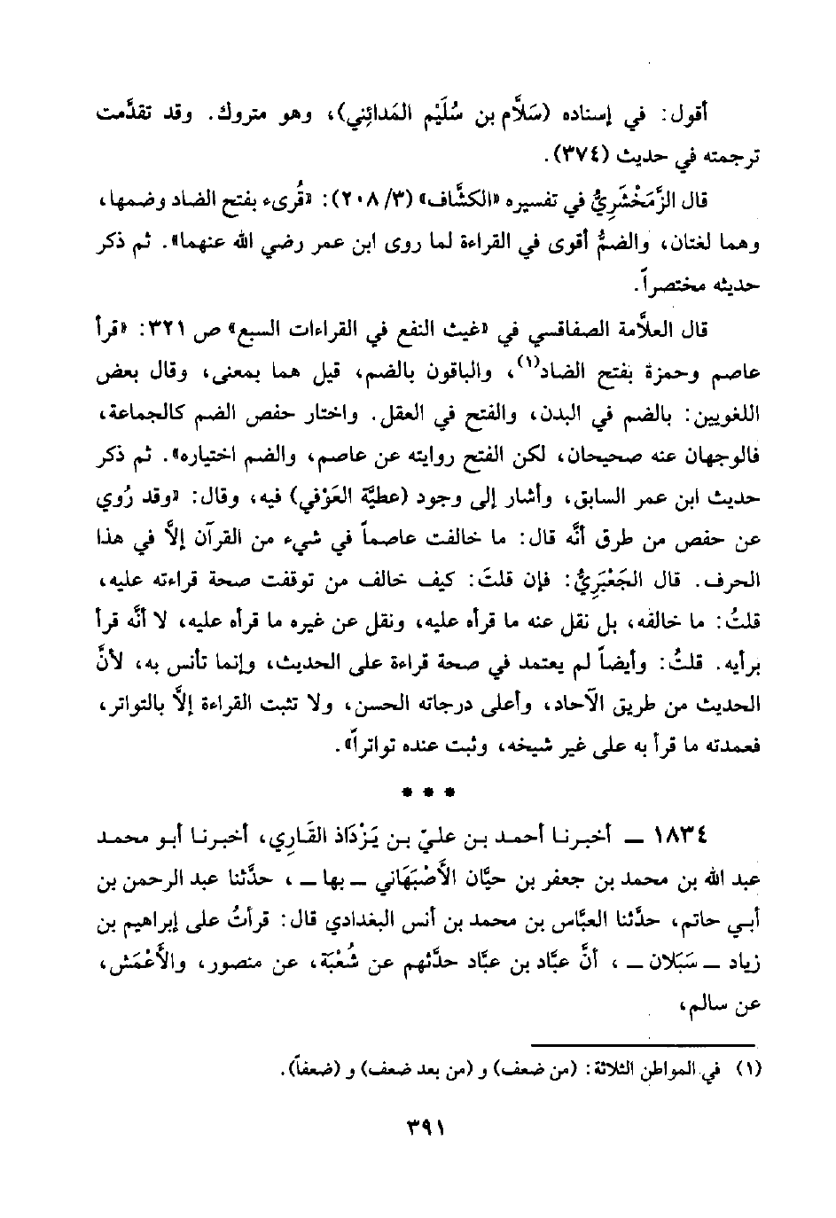 قال العلَّامة الصفاقسي في "غيث النفع في القراءات السبع" ص ٣٢١: "قرأ عاصم وحمزة بفتح الضاد (¬١)، والباقون بالضم، قبل هما بمعنى، وقال بعض اللغويين: بالضم في البدن، والفتح في العقل. واختار حفص الضم كالجماعة، فالوجهان عنه صحيحان، لكن الفتح روايته عن عاصم، والضم اختياره". ثم ذكر حديث ابن عمر السابق، وأشار إلى وجود (عطيَّة العَوْفي) فيه، وقال: "وقد رُوي عن حفص من طرق أنَّه قال: ما خالفت عاصمًا في شيء من القرآن إلَّا في هذا الحرف. قال الجَعْبَرِيُّ: فإن قلتَ: كيف خالف من توقفت صحة قراءته عليه، قلتُ: ما خالفه، بل نقل عنه ما قرأه عليه، ونقل عن غيره ما نراه عليه، لا أنَّه قرأ برأيه. قلتُ: وأيضًا لم يعتمد في صحة قراءة على الحديث، وإنما تأنس به، لأنَّ الحديث من طريق الآحاد، واعلى درجاته الحسن، ولا تثبت القراءة إلَّا بالتواتر، فعمدته ما قرأ به على غير شيخه، وثبت عنده تواترًا".