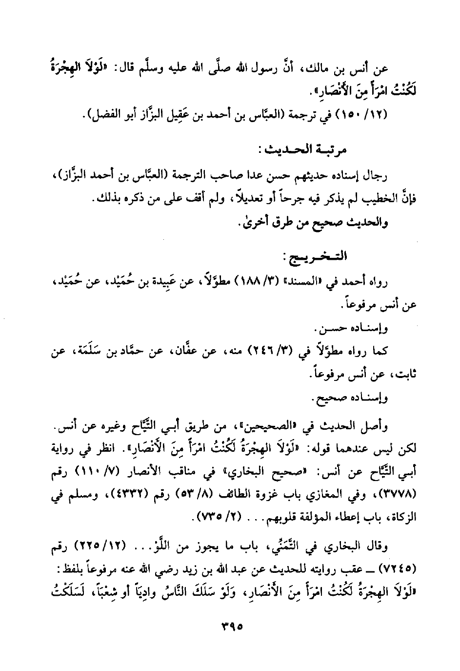 عن أنس بن مالك، أنَّ رسول اللَّه صلَّى اللَّه عليه وسلَّم قال: "لَوْلَا الهِجْرَةُ لَكُنْتُ امْرَأً مِنَ الأَنْصَارِ".